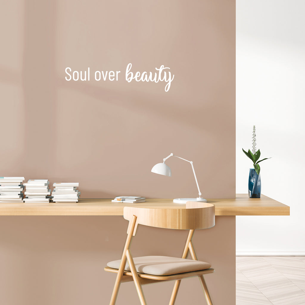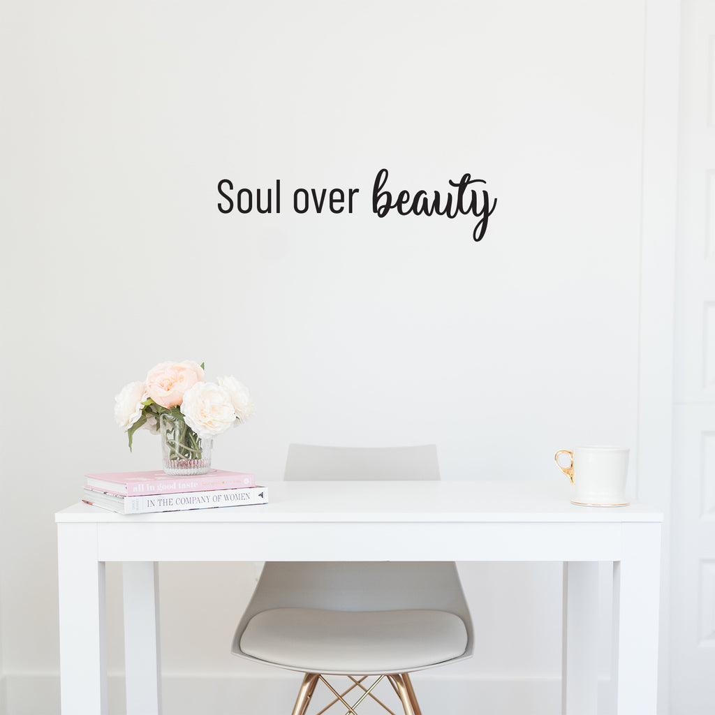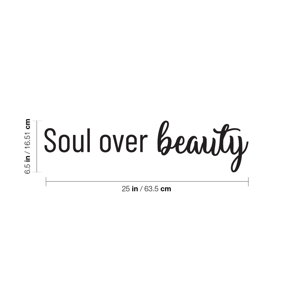 This awesome cute & inspirational decal quote "Soul Over Beauty"; is the perfect touch for your home or office. Use it for your make up mirror; bathroom; closet or anywhere you want to bring some extra positive decoration. It's a vinyl sticker that is easy to put on any smooth and dry surface. Our modern designs don't just brighten up the room; but brighten up the day. Using top of the line vinyl across all of our production allows us to be the leaders in quality and design.