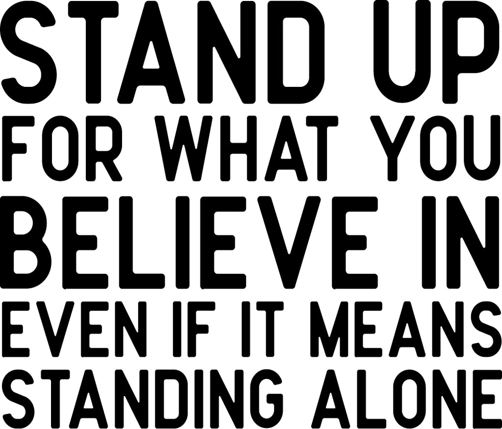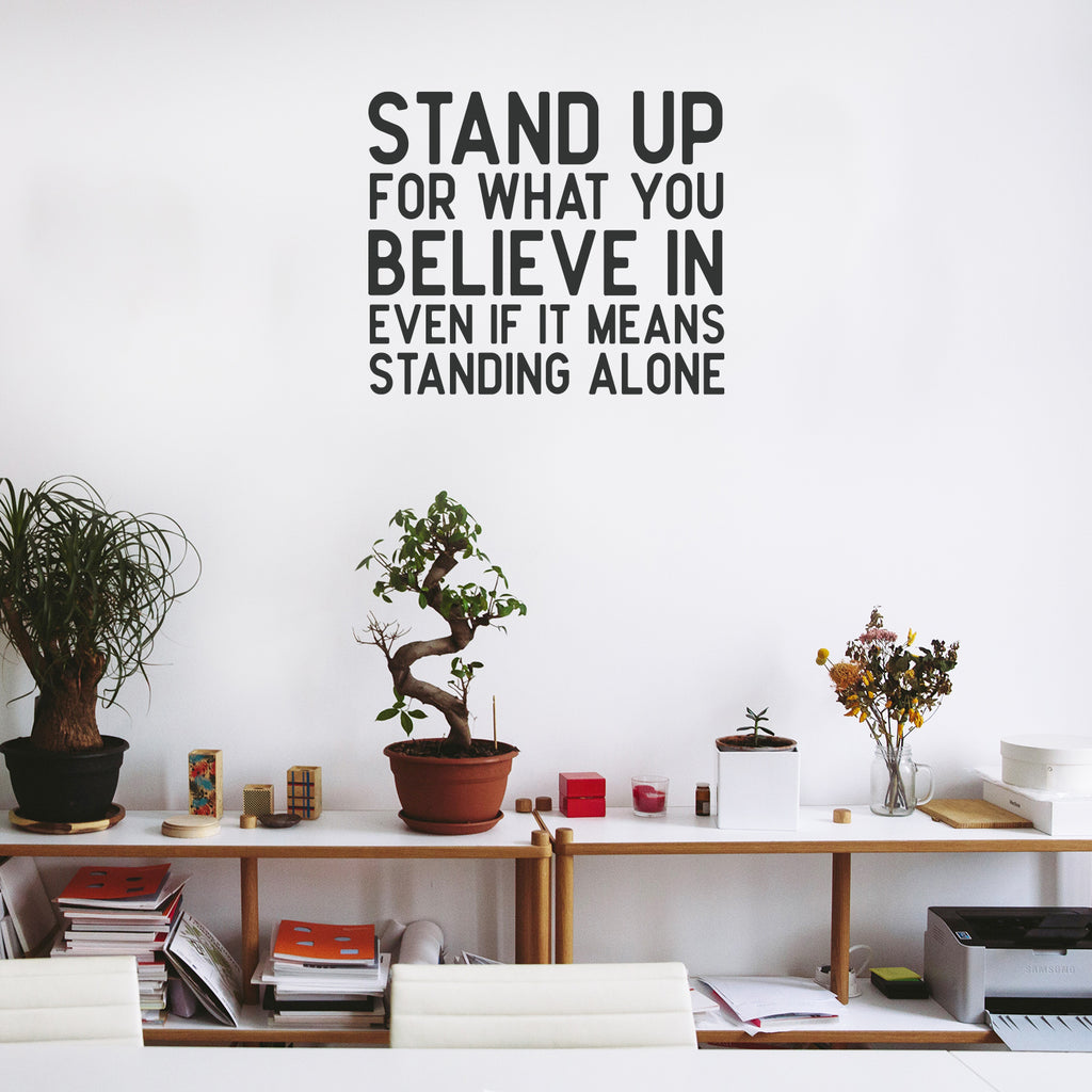 This motivating "Stand up for what you believe in; even if it means standing alone" life quotes wall art decal is inspiring and the perfect touch for both indoor and outdoor decoration. It’s a vinyl sticker that is easy to put on almost any smooth surface and really brings a room together adding the perfect touch of decoration. This vinyl decal quote motivates people to be positive and stand up for what is right in any aspect of life whether it’s theirs or someone else that needs to be stood up for; even if no one else agrees. Our inspiring quotes don’t just brighten up the room; but brighten up the day. Using top of the line vinyl across all of our production allows us to be the leaders in quality and design.The easiest surfaces for vinyl to stick on is Windows Walls Mirrors Dorm Rooms Cars Lockers Flat and Smooth Surfaces Tables and Glass CabinetsAll vinyl packages come with easy to follow instructions further explaining just how simple it is to apply vinyl on and off your surface of choice. Prior to applying the vinyl; be sure the surface is clean and oil free for best results. This vinyl is waterproof and is not permanent so it’s not only easy to use but easy to remove as well. In general; vinyl lettering is one of the latest and greatest trends in home decoration. Because our products are high quality; they give the illusion of painted wall art without the mess; cost; or time. What are you waiting for? Let’s get crafty!