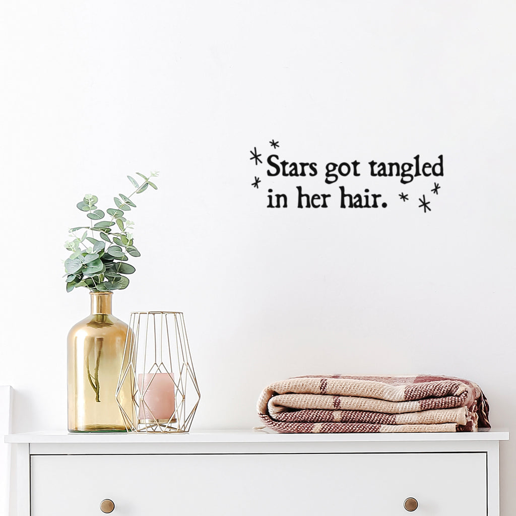 This awesome decal quote "Stars Got Tangled In Her Hair"; is the perfect touch for your home or office. Use it for your bedroom; store; living room or anywhere you want to bring some extra optimistic decoration. It's a vinyl sticker that is easy to put on any smooth and dry surface. Our modern designs don't just brighten up the room; but brighten up the day. Using top of the line vinyl across all of our production allows us to be the leaders in quality and design.