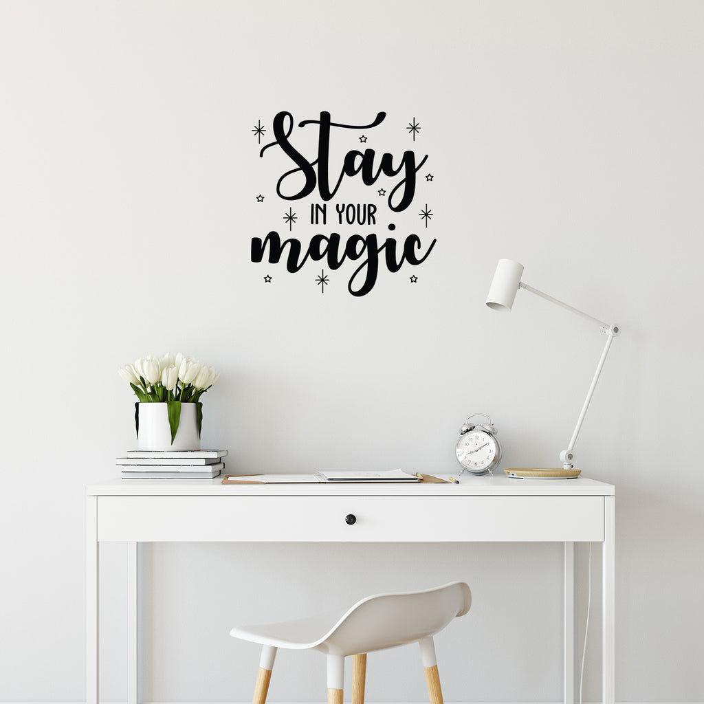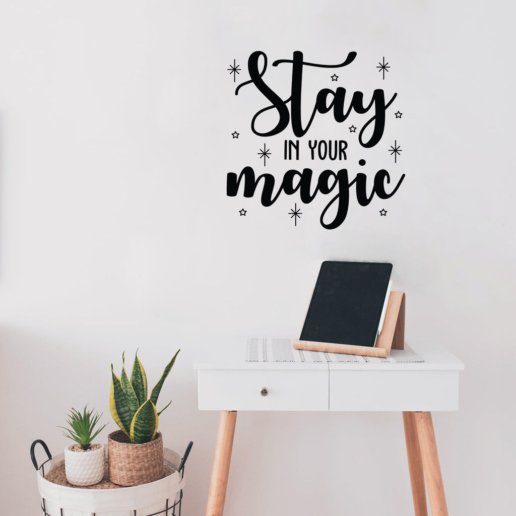 This awesome positive decal quote "Stay In Your Magic"; is the perfect touch for your home or office. Use it for your bedroom; store; living room or anywhere you want to bring some extra optimistic decoration. It's a vinyl sticker that is easy to put on any smooth and dry surface. Our modern designs don't just brighten up the room; but brighten up the day. Using top of the line vinyl across all of our production allows us to be the leaders in quality and design.
