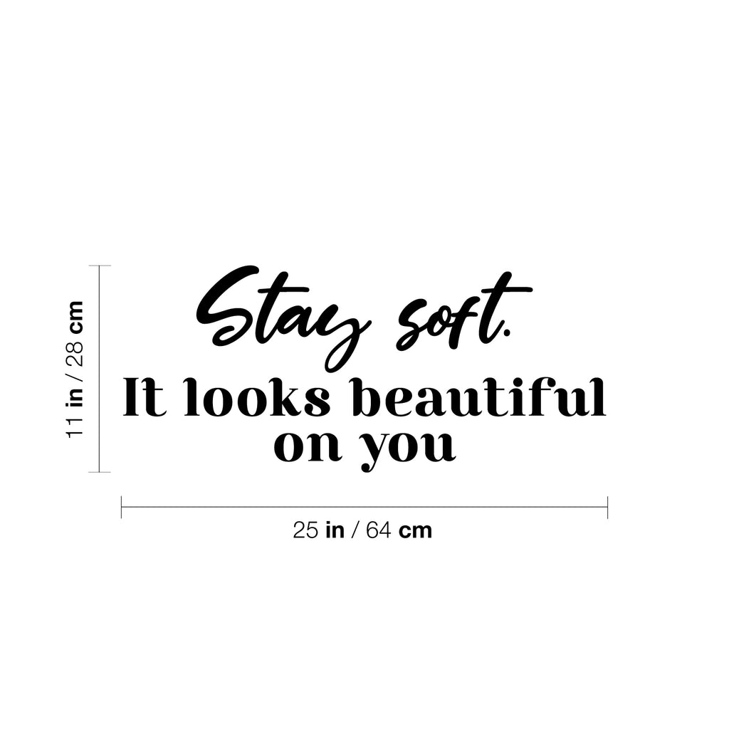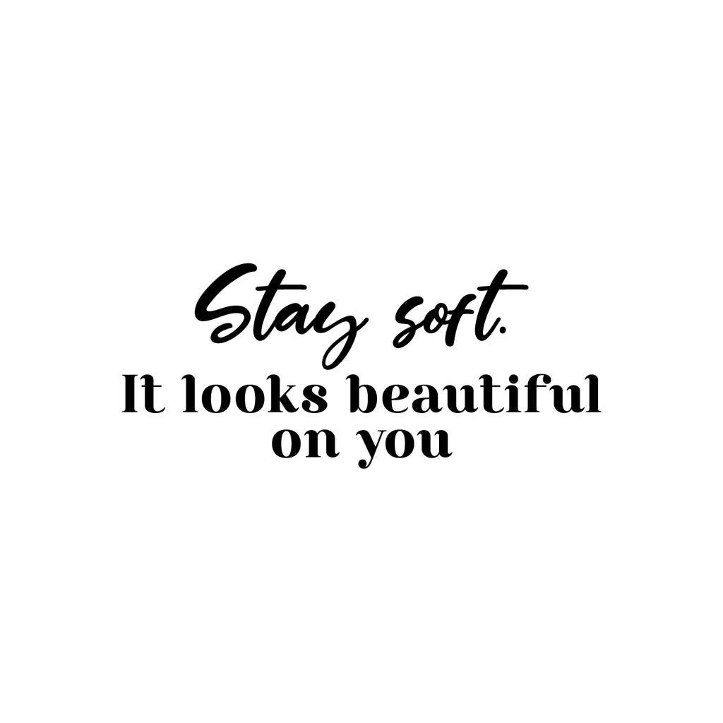 This awesome motivational & positive decal quote "Stay Soft. It Looks Beautiful On You"; is the perfect touch for your home or office. Use it for your living room; office; coffee shop or anywhere you want to bring some extra cute decoration. It's a vinyl sticker that is easy to put on any smooth and dry surface. Our modern designs don't just brighten up the room; but brighten up the day. Using top of the line vinyl across all of our production allows us to be the leaders in quality and design.