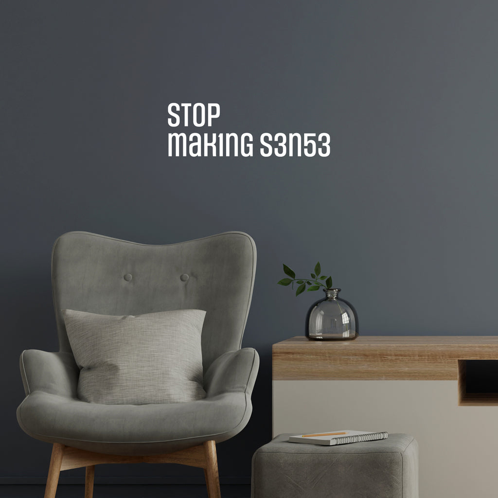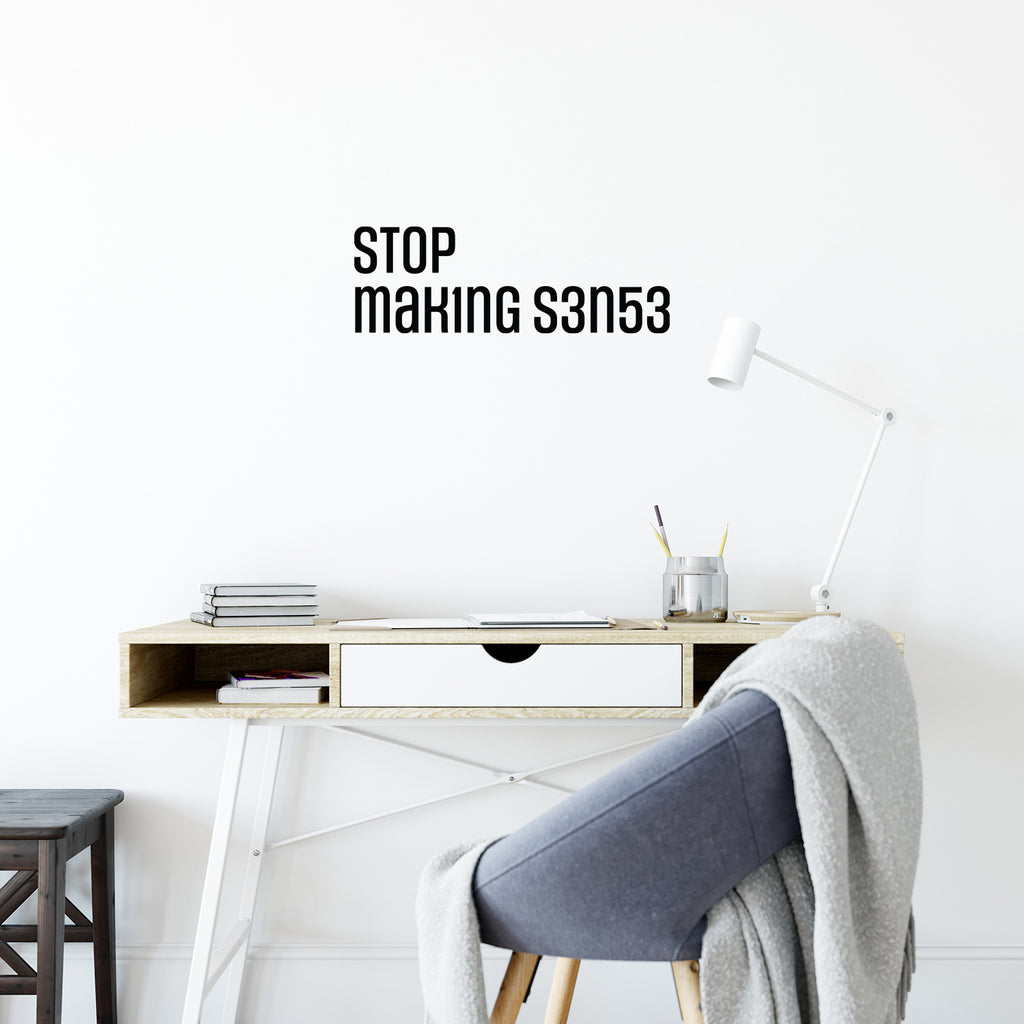 This awesome positive decal quote "Stop Mak1ng S3n53"; is the perfect touch for your home or school. Use it for your classroom; playroom; kids room or anywhere you want to bring some extra inspiring decoration. It's a vinyl sticker that is easy to put on any smooth and dry surface. Our modern designs don't just brighten up the room; but brighten up the day. Using top of the line vinyl across all of our production allows us to be the leaders in quality and design.