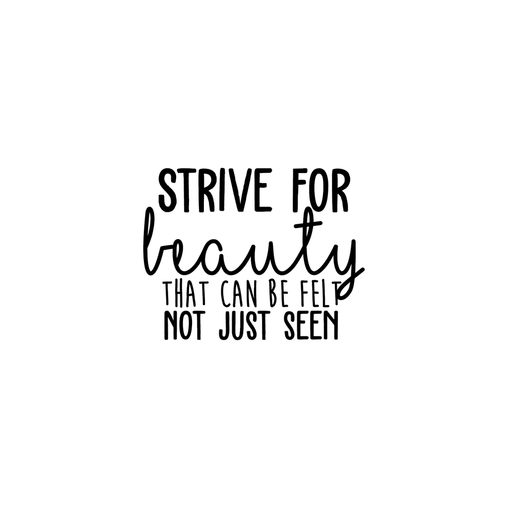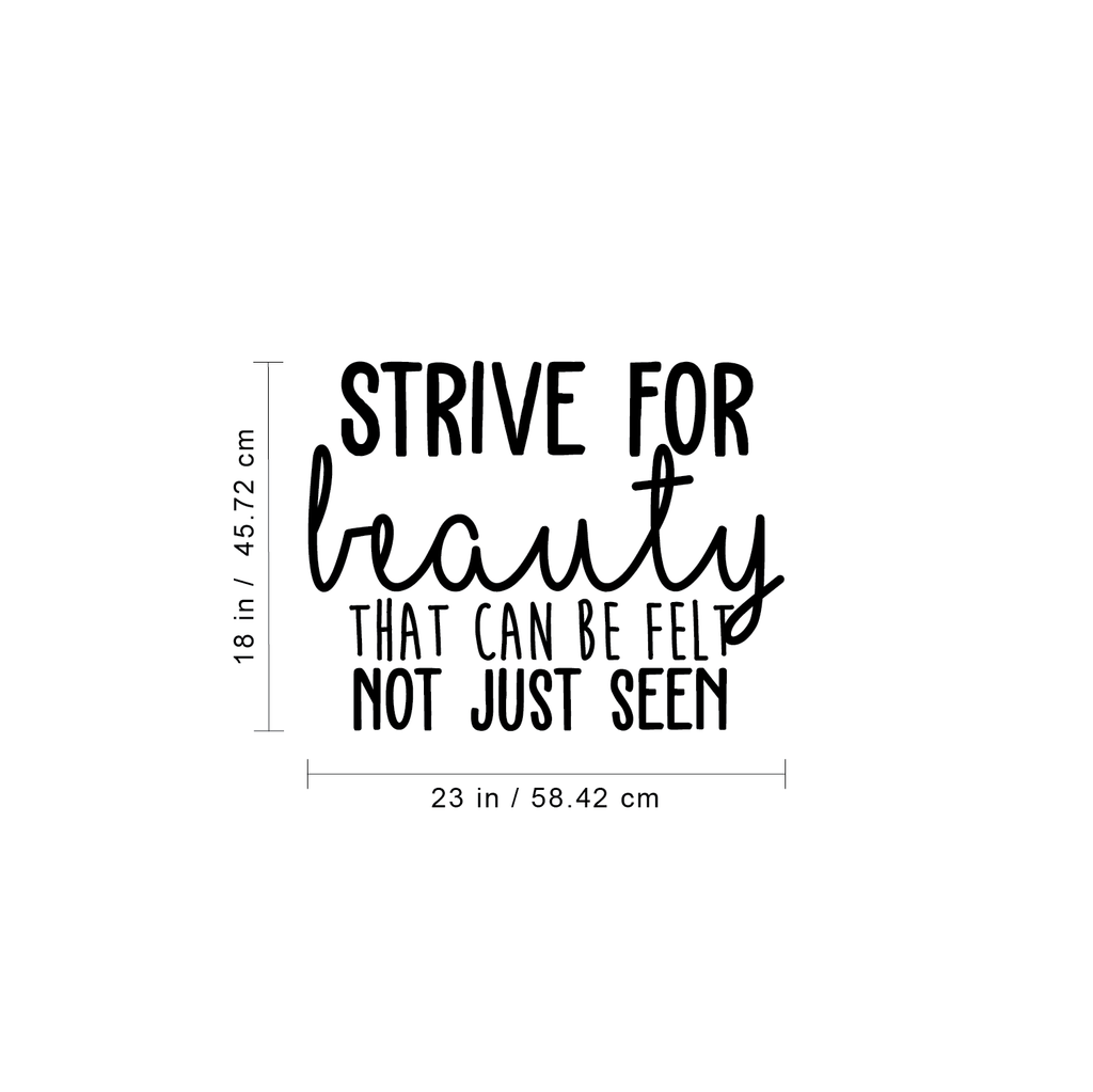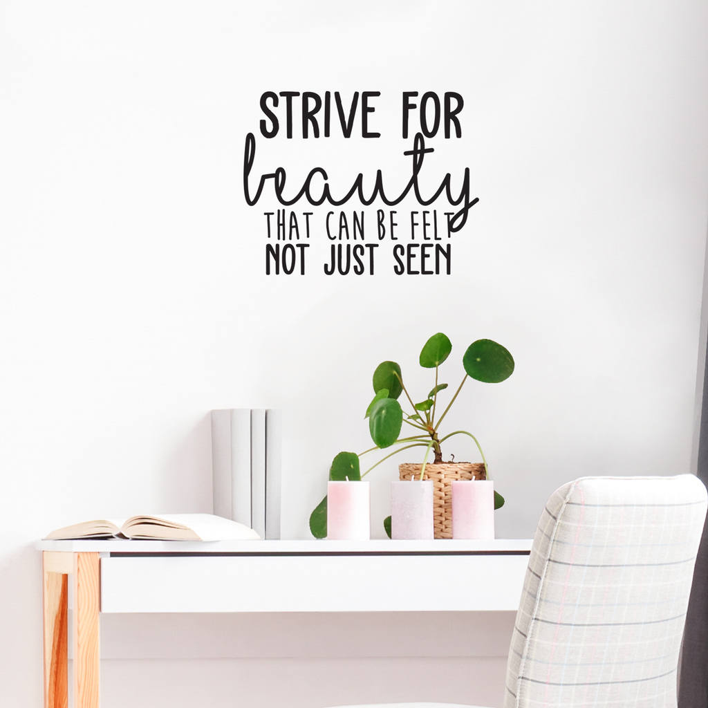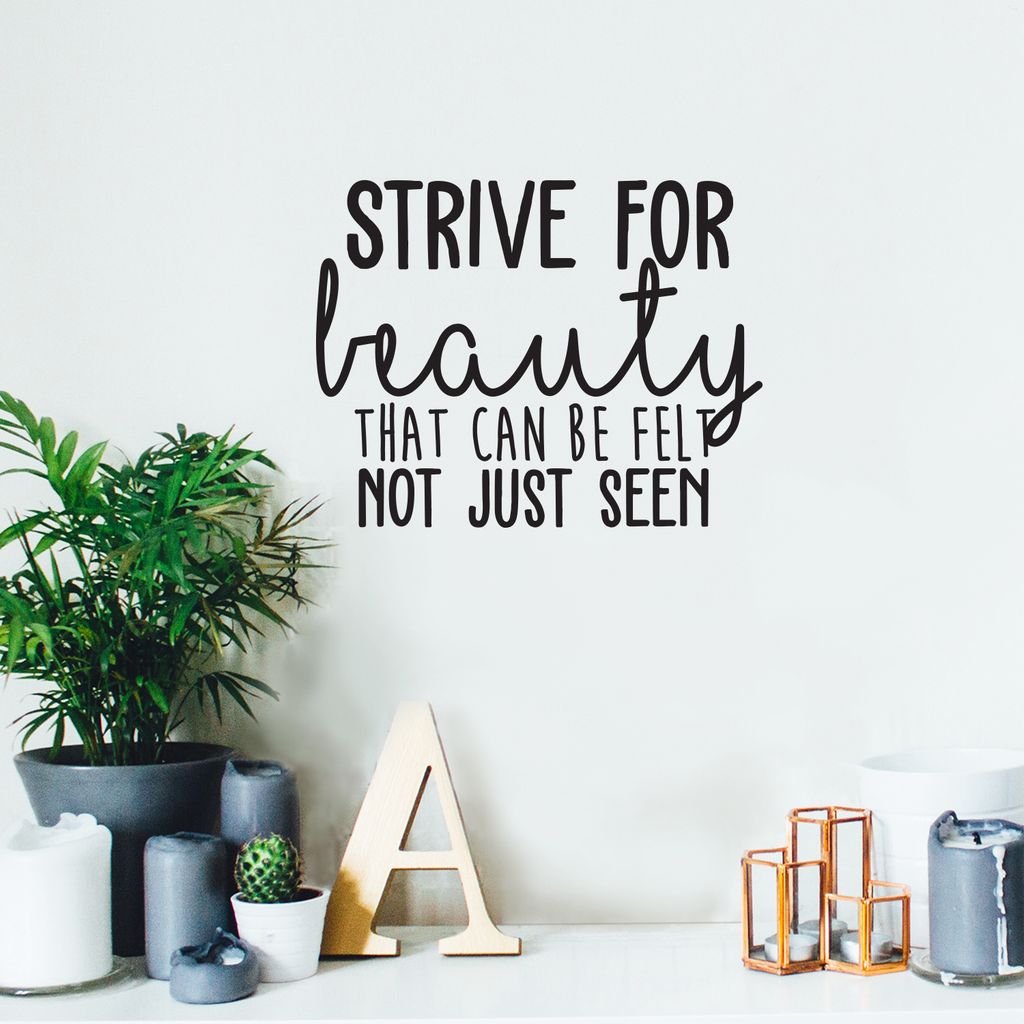 This awesome positive decal quote "Strive For Beauty That Can Be Felt Not Just Seen"; is the perfect touch for your home or office. Use it for your bedroom; closet; living room or anywhere you want to bring some extra positive decoration. It's a vinyl sticker that is easy to put on any smooth and dry surface. Our modern designs don't just brighten up the room; but brighten up the day. Using top of the line vinyl across all of our production allows us to be the leaders in quality and design.