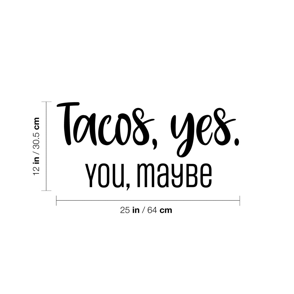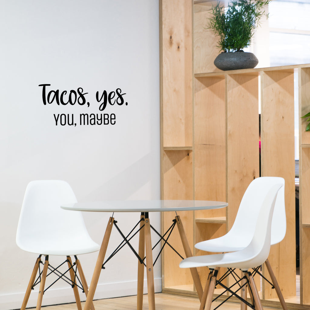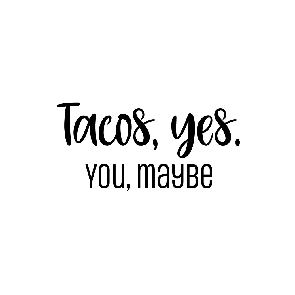 This awesome fun decal quote "Tacos; Yes. You; Maybe"; is the perfect touch for your home or business. Use it for your kitchen; living room; office kitchenette or anywhere you want to bring some extra cute decoration. It's a vinyl sticker that is easy to put on any smooth and dry surface. Our modern designs don't just brighten up the room; but brighten up the day. Using top of the line vinyl across all of our production allows us to be the leaders in quality and design.