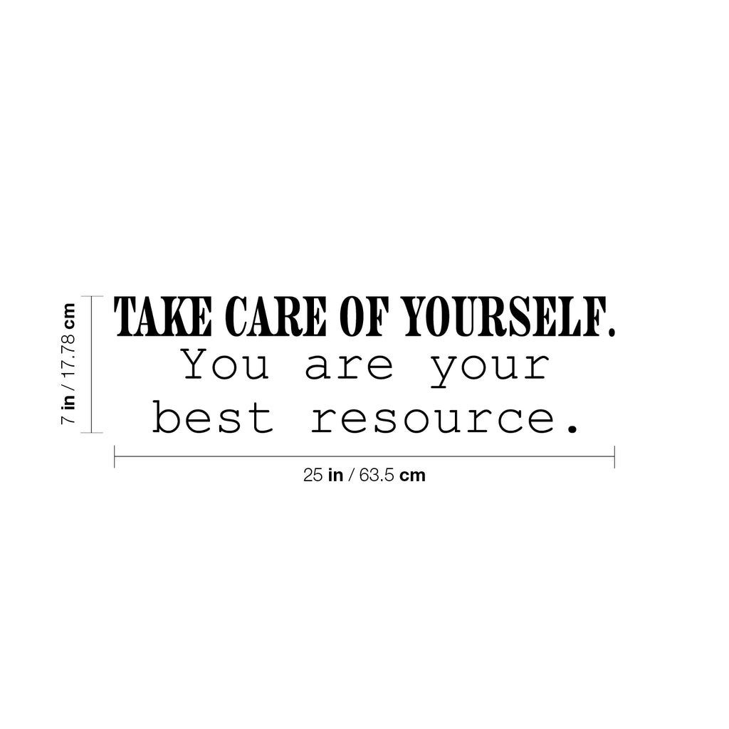 This awesome motivational decal quote "Take Care Of Yourself. You Are Your Best Resource"; is the perfect touch for your home. Use it for your bedroom; closet; classroom or anywhere you want to bring some extra positive decoration. It's a vinyl sticker that is easy to put on any smooth and dry surface. Our modern designs don't just brighten up the room; but brighten up the day. Using top of the line vinyl across all of our production allows us to be the leaders in quality and design.