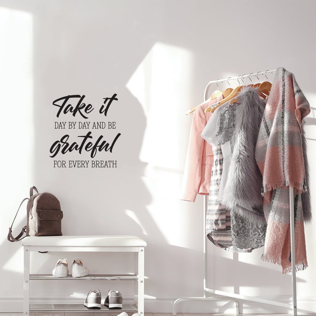 This decal quote "Take It Day By Day And Be Grateful For Every Breath"; is the perfect touch for your home. Use it for your dorm room or anywhere you want to bring some extra decoration. It's a vinyl sticker that is easy to put on any smooth and dry surface. Our modern designs don't just brighten up the room; but brighten up the day. Using top of the line vinyl across all of our production allows us to be the leaders in quality and design.