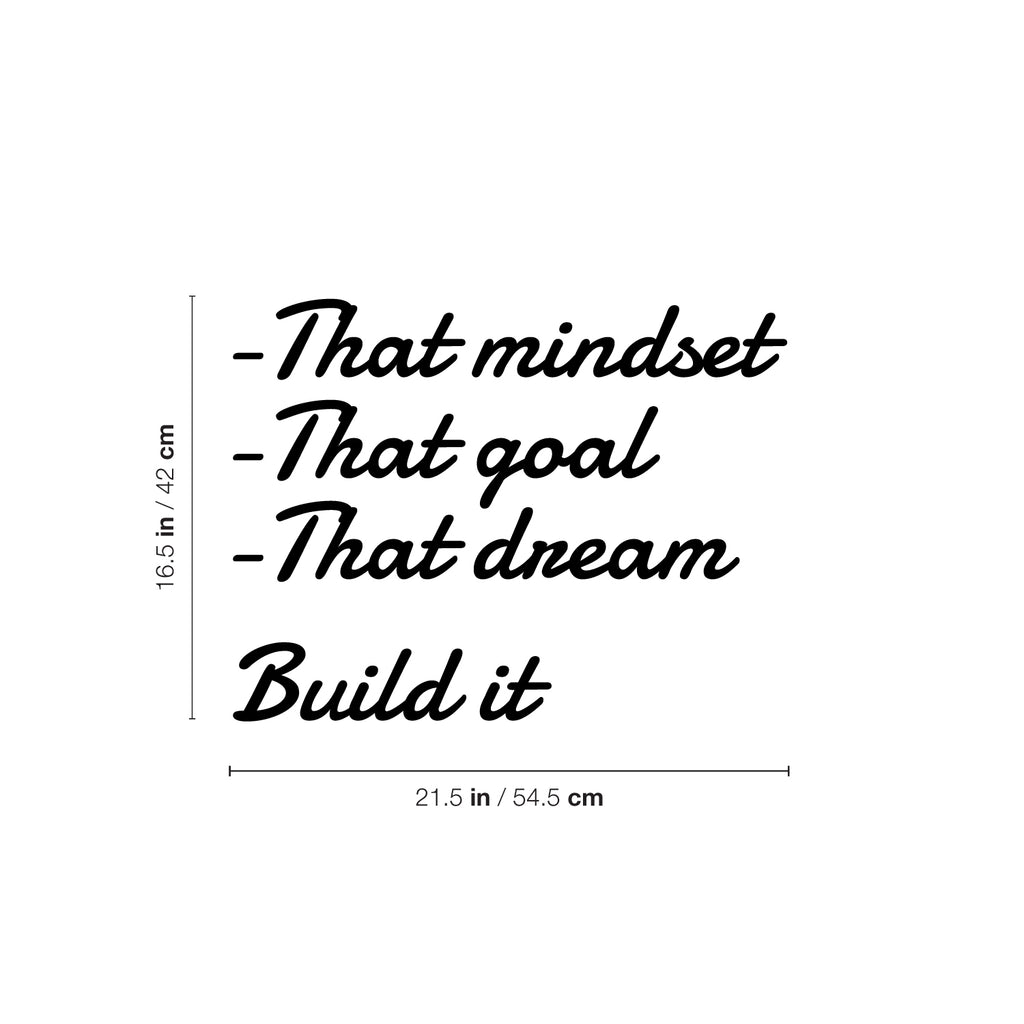 This awesome positive decal quote "That Mindset That Goal Build It"; is the perfect touch for your fitness center or home. Use it for your mirrors; workout room; fitness center or anywhere you want to bring some extra positive decoration. It's a vinyl sticker that is easy to put on any smooth and dry surface. Our modern designs don't just brighten up the room; but brighten up the day. Using top of the line vinyl across all of our production allows us to be the leaders in quality and design.