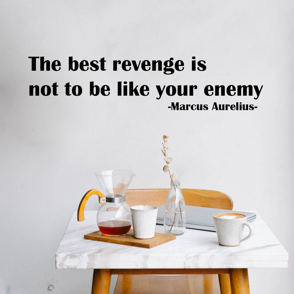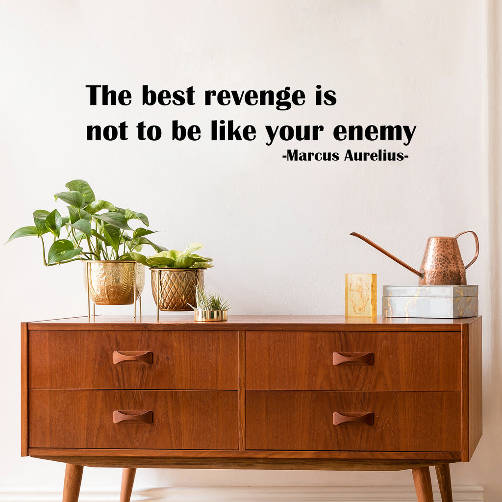 This motivational & positive decal quote "The Best Revenge Is Not To Be Like Your Enemy"; is the perfect touch for your school or office. Use it for your living room; coffee shop; classroom or anywhere you want to bring some extra inspirational decoration. It's a vinyl sticker that is easy to put on any smooth and dry surface. Our modern designs don't just brighten up the room; but brighten up the day. Using top of the line vinyl across all of our production allows us to be the leaders in quality and design.
