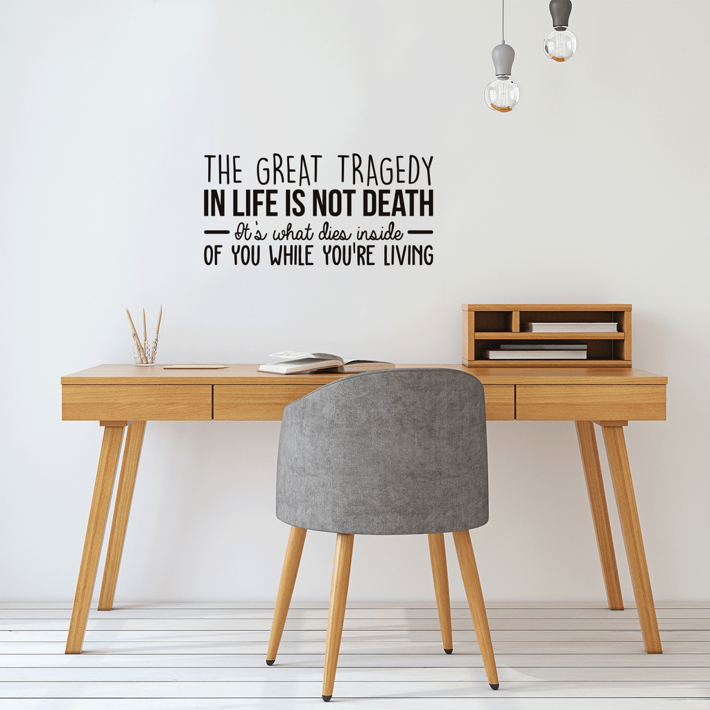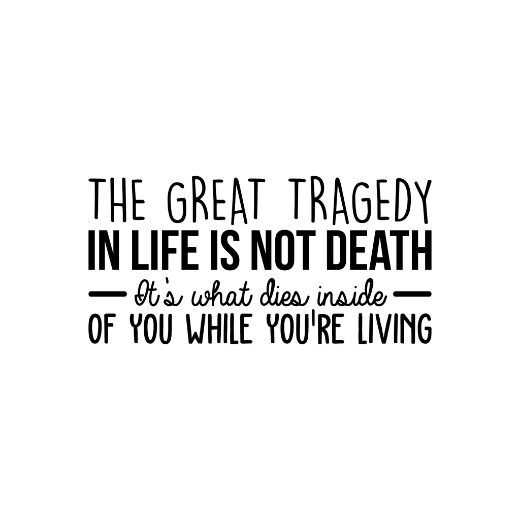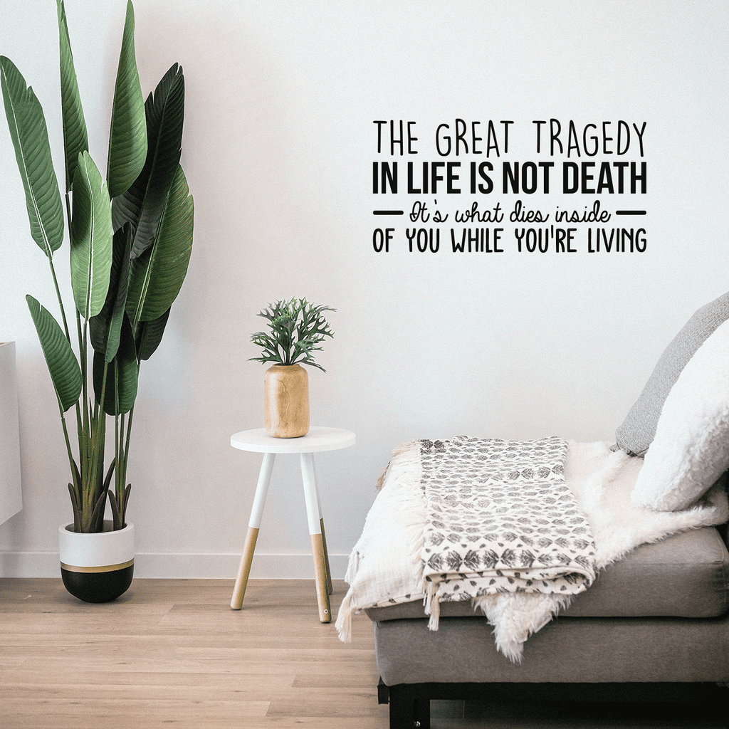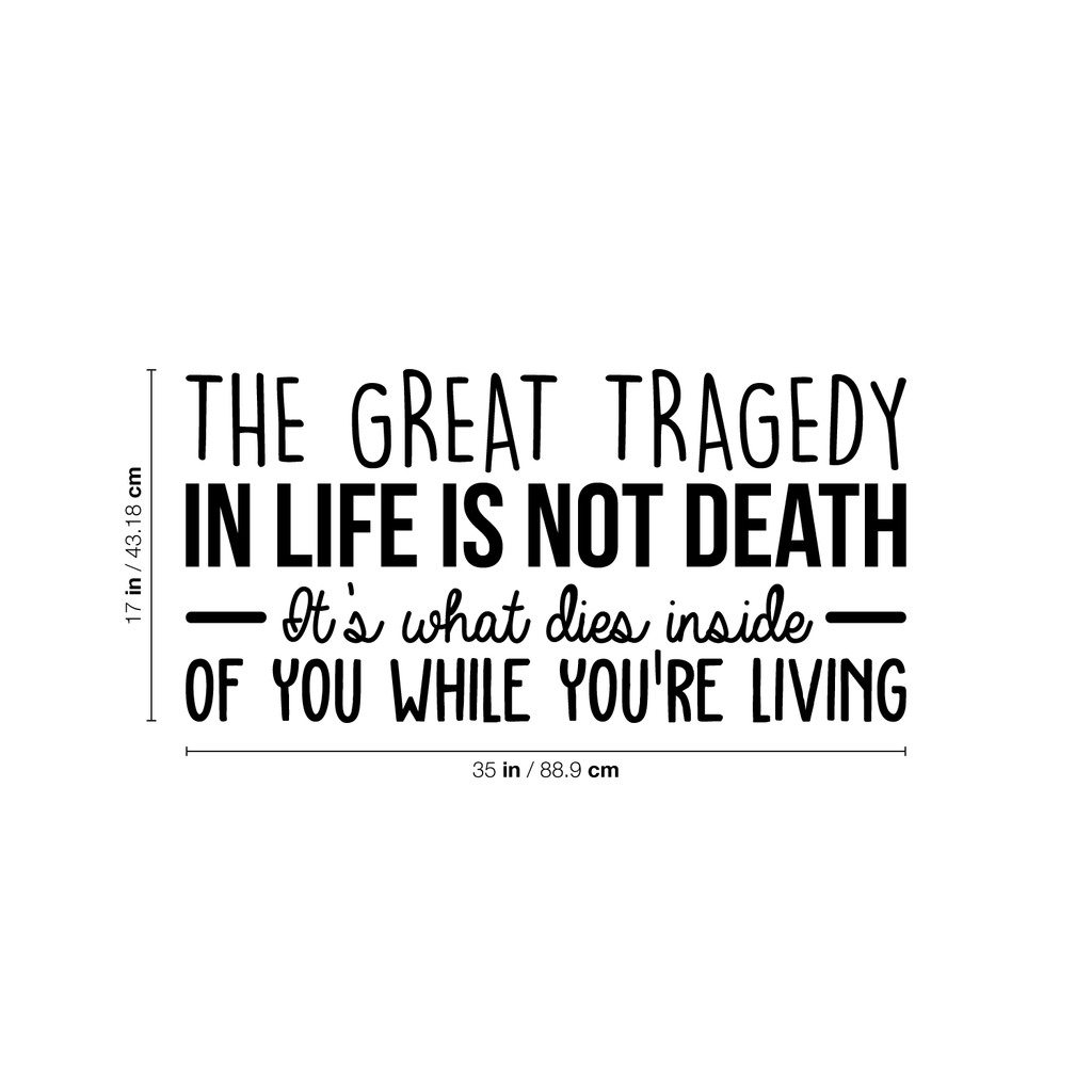 This cute & inspirational decal quote "The Great Tragedy In Life Is Not Death It's What Dies Inside Of You While You're Living"; is the perfect touch for your home or office. Use it for your living room; classroom or anywhere you want to bring some extra cute decoration. It's a vinyl sticker that is easy to put on any smooth and dry surface. Our modern designs don't just brighten up the room; but brighten up the day. Using top of the line vinyl across all of our production allows us to be the leaders in quality and design.