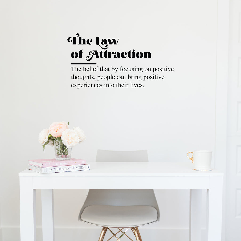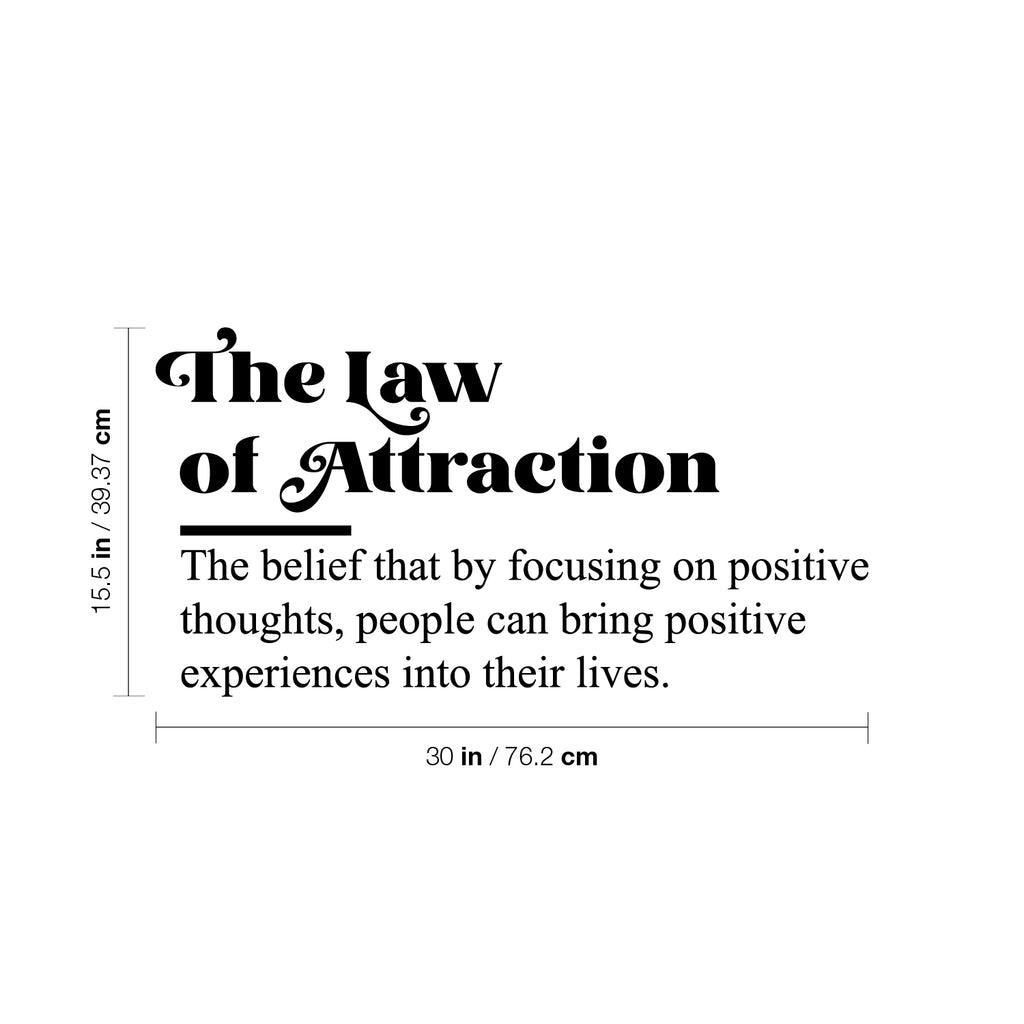 This awesome motivational decal quote "The Law Of Attraction. The Belief That By Focusing On Positive Thoughts; People Can Bring Positive Experiences Into Their Lives."; is the perfect touch for your home or school. Use it for your living room; playroom; kids room or anywhere you want to bring some extra cute decoration. It's a vinyl sticker that is easy to put on any smooth and dry surface. Our modern designs don't just brighten up the room; but brighten up the day. Using top of the line vinyl across all of our production allows us to be the leaders in quality and design.