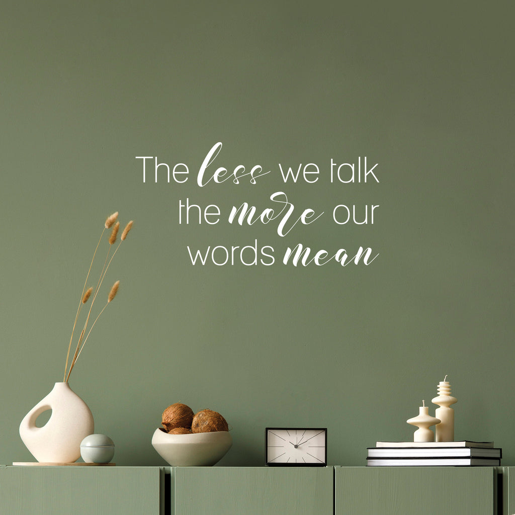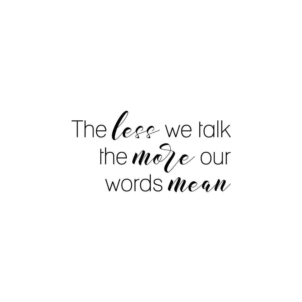 This awesome positive decal quote "The Less We Talk The More Our Words Mean"; is the perfect touch for your home or school. Use it for your classroom; office or anywhere you want to bring some extra positive decoration. It's a vinyl sticker that is easy to put on any smooth and dry surface. Our modern designs don't just brighten up the room; but brighten up the day. Using top of the line vinyl across all of our production allows us to be the leaders in quality and design.