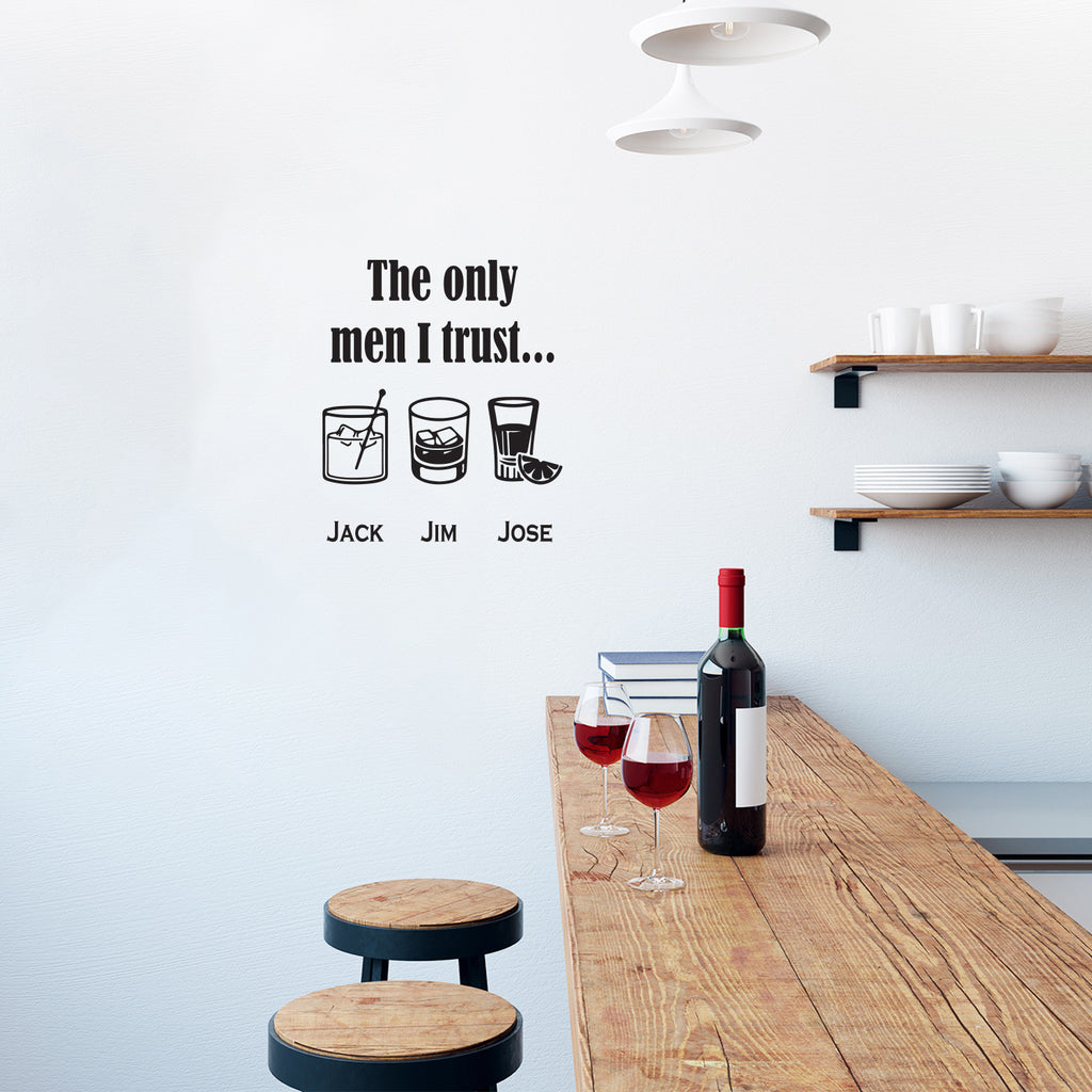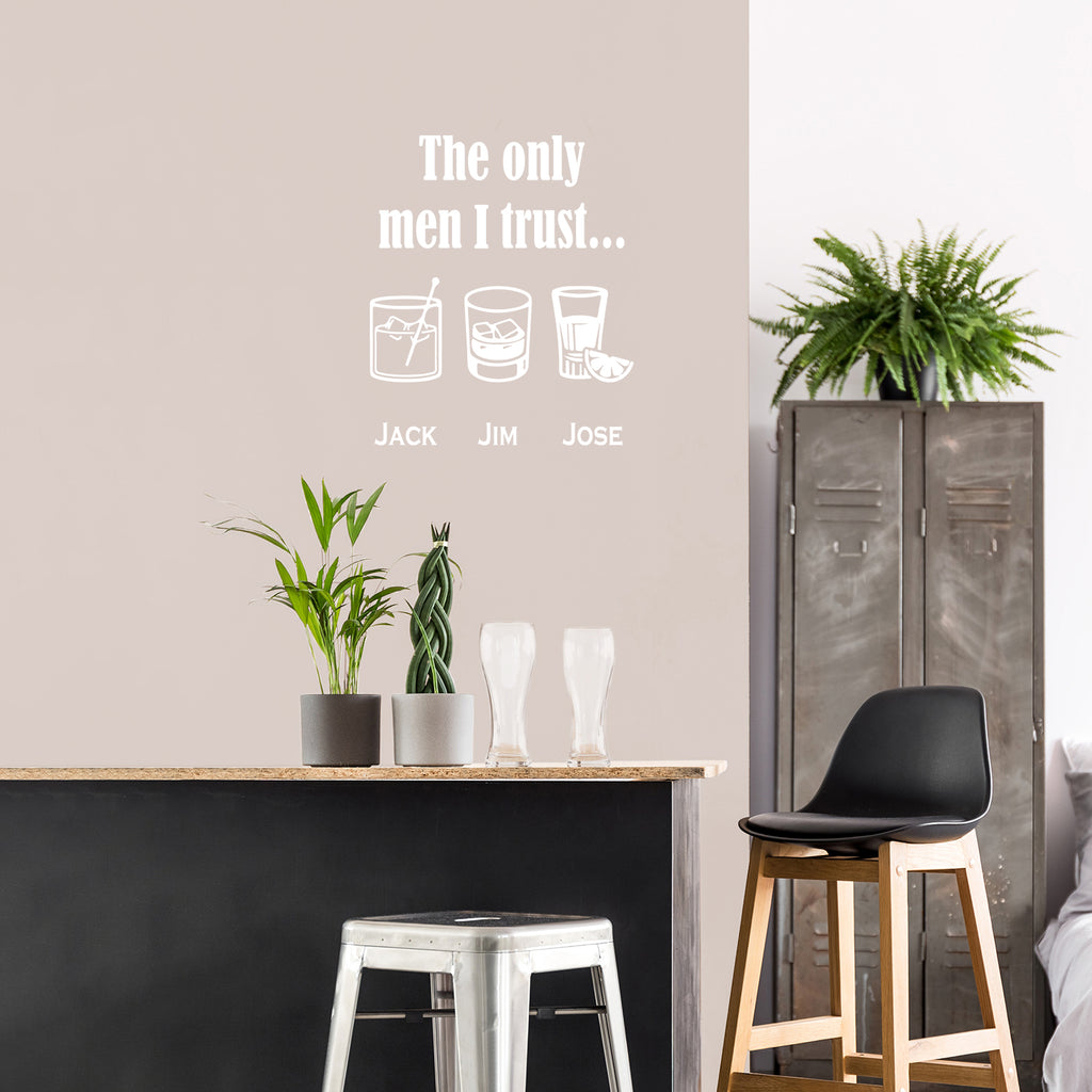 This awesome funny decal quote "The Only Men I Trust Jack Jim Jose"; is the perfect touch for your bar storefront. Use it for your living room; restaurant; coffee shop or anywhere you want to bring some extra cute decoration. It's a vinyl sticker that is easy to put on any smooth and dry surface. Our modern designs don't just brighten up the room; but brighten up the day. Using top of the line vinyl across all of our production allows us to be the leaders in quality and design.