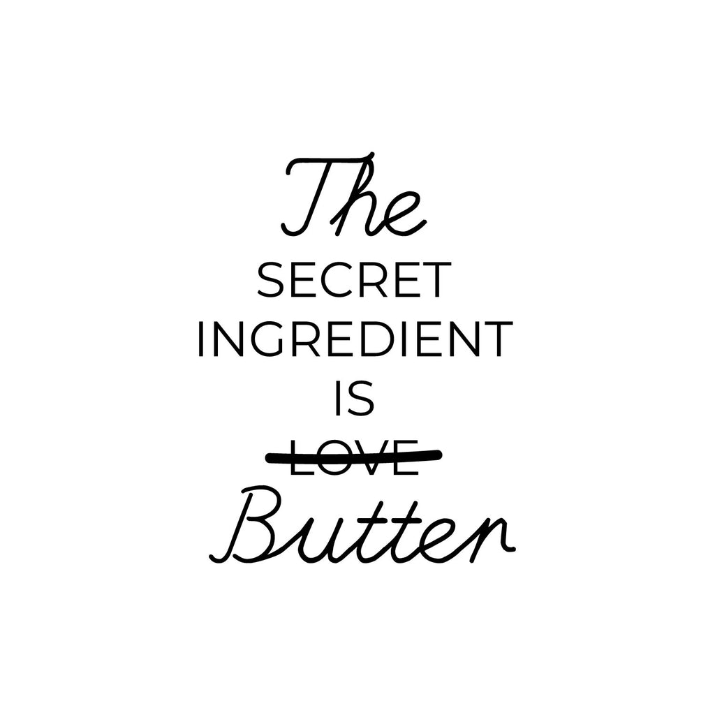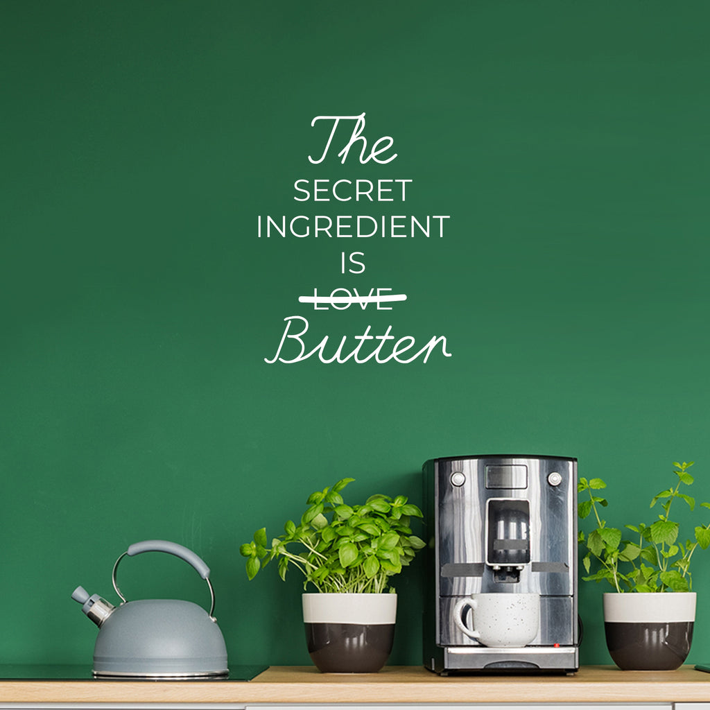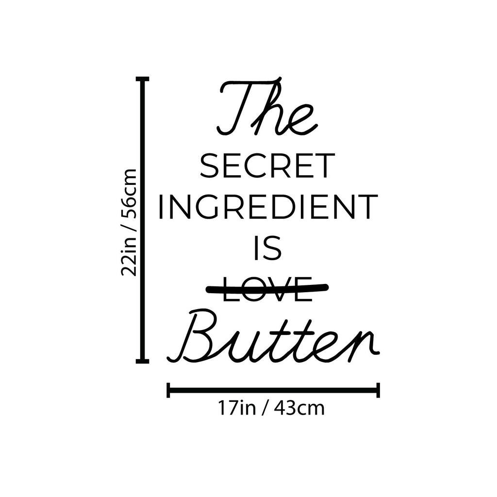 This awesome funny decal quote "The Secret Ingredient Is Butter"; is the perfect touch for your home. Use it for your dining room; restaurant; kitchen or anywhere you want to bring some extra decoration. It's a vinyl sticker that is easy to put on any smooth and dry surface. Our modern designs don't just brighten up the room; but brighten up the day. Using top of the line vinyl across all of our production allows us to be the leaders in quality and design.