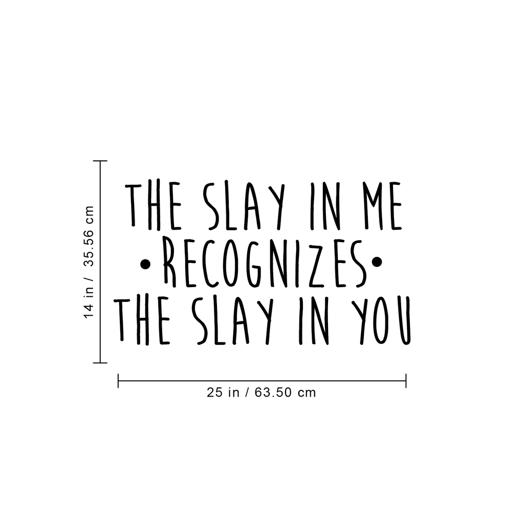 This modern decal quote "The Slay In Me Recognizes The Slay In You"; is the perfect touch for your home or workplace. Use it for your dorm room; apartment; home office or anywhere you want to bring some extra decoration. It's a vinyl sticker that is easy to put on any smooth and dry surface. Our modern designs don't just brighten up the room; but brighten up the day. Using top of the line vinyl across all of our production allows us to be the leaders in quality and design.