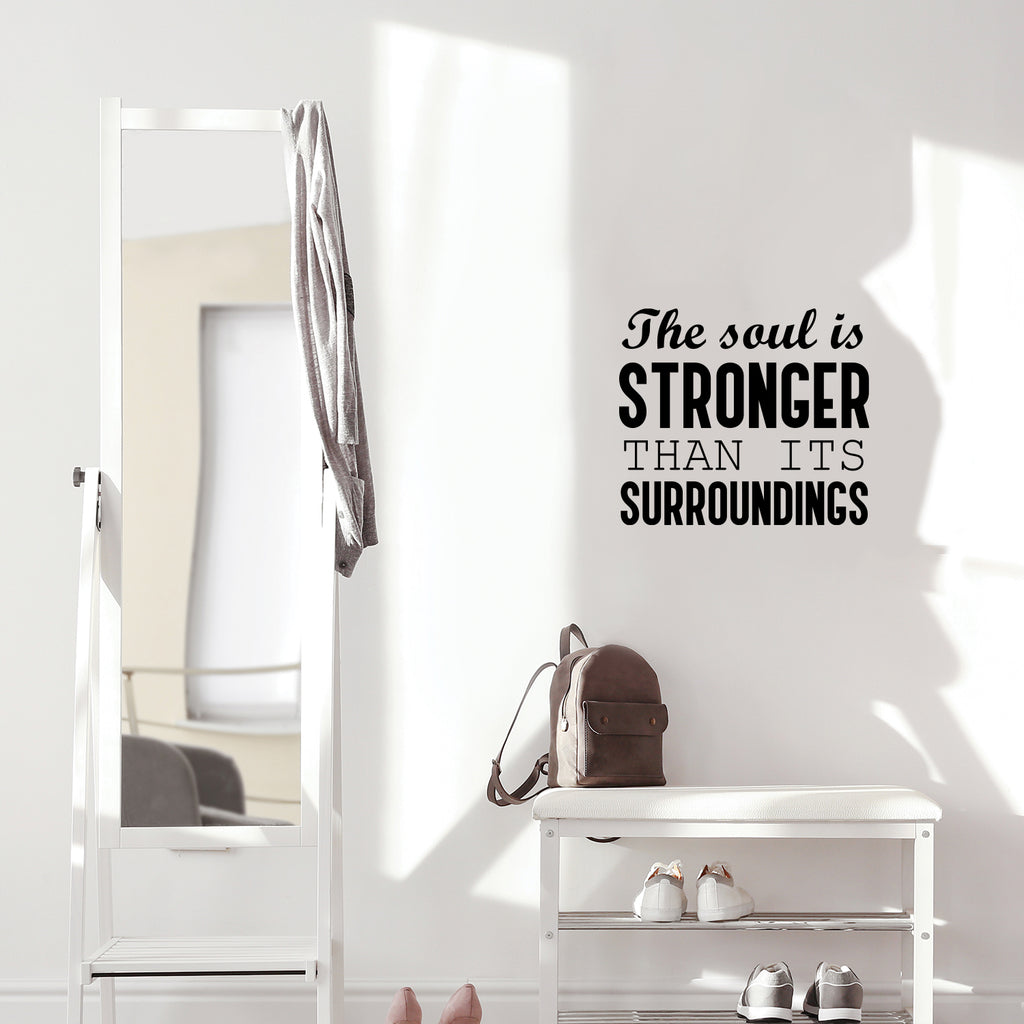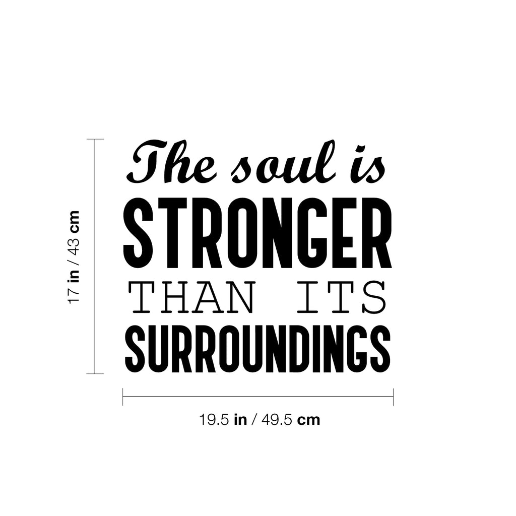 This awesome lovely decal quote "The Soul Is Stronger Than Its Surroundings" is the perfect touch for your home or office. Use it for your living room; playroom; coffee shop or anywhere you want to bring some extra cute decoration. It's a vinyl sticker that is easy to put on any smooth and dry surface. Our modern designs don't just brighten up the room; but brighten up the day. Using top of the line vinyl across all of our production allows us to be the leaders in quality and design.