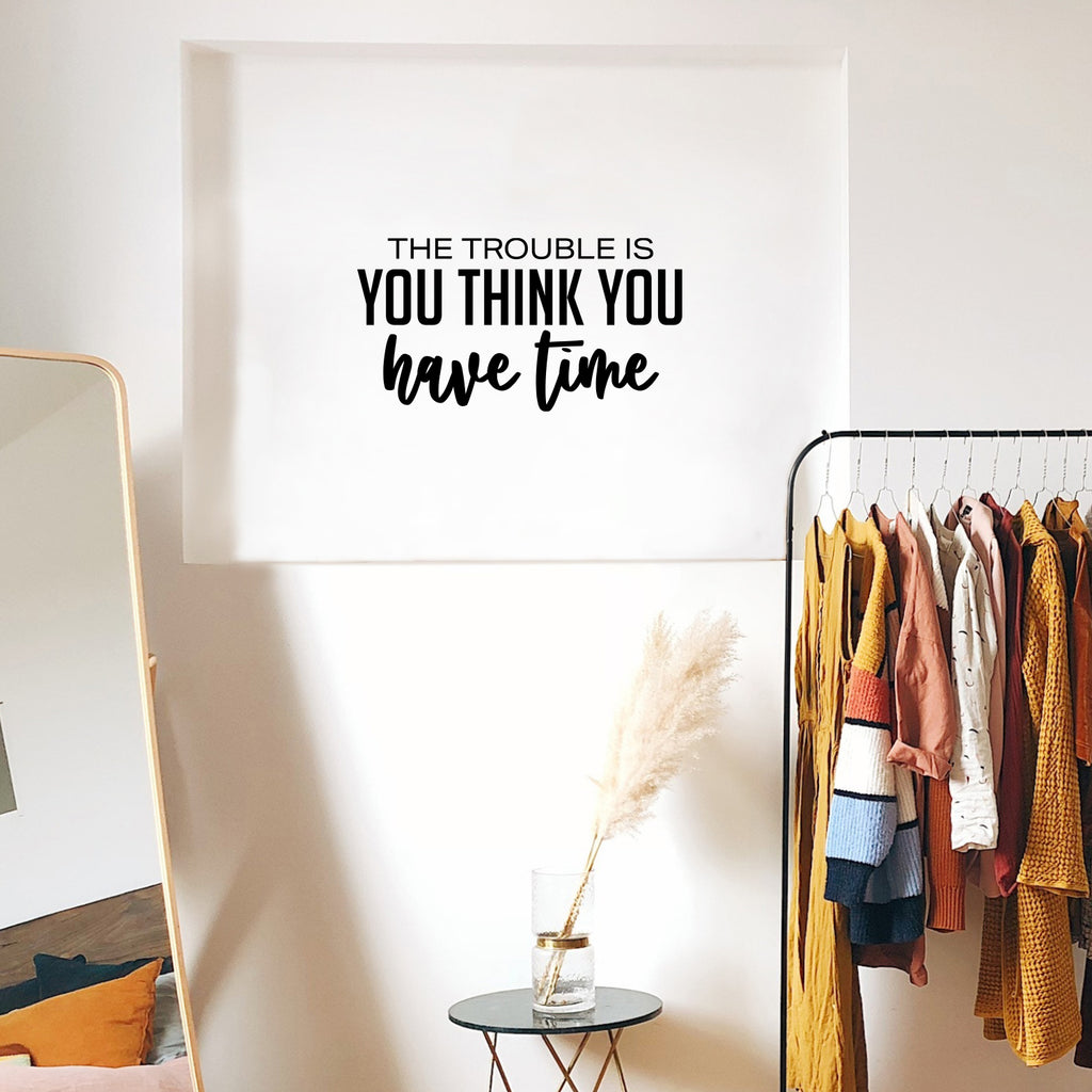 This modern positive & motivational decal quote "The Trouble Is You Think You Have Time"; is the perfect touch for your fitness center or home gym. Use it for your office; yoga classes; studio dance or anywhere you want to bring some extra positive decoration. It's a vinyl sticker that is easy to put on any smooth and dry surface. Our modern designs don't just brighten up the room; but brighten up the day. Using top of the line vinyl across all of our production allows us to be the leaders in quality and design.