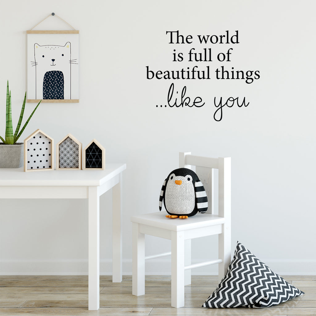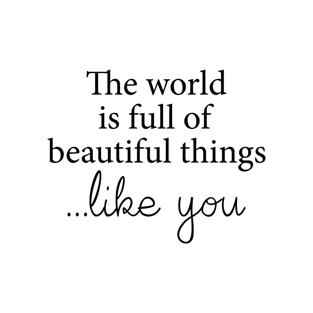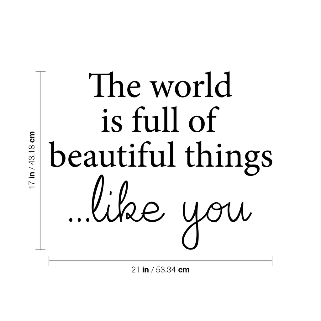 This great decal quote "The World Is Full Of Beautiful Things... Like You"; is the perfect touch for your home. Use it for your makeup area; dorm room or anywhere you want to bring some extra decoration. It's a vinyl sticker that is easy to put on any smooth and dry surface. Our modern designs don't just brighten up the room; but brighten up the day. Using top of the line vinyl across all of our production allows us to be the leaders in quality and design.