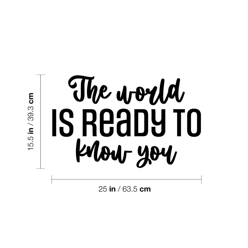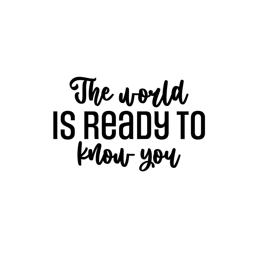This awesome positive decal quote "The World Is Ready To Know You"; is the perfect touch for your home or office. Use it for your store; coffee shop or anywhere you want to bring some extra inspiring decoration. It's a vinyl sticker that is easy to put on any smooth and dry surface. Our modern designs don't just brighten up the room; but brighten up the day. Using top of the line vinyl across all of our production allows us to be the leaders in quality and design.