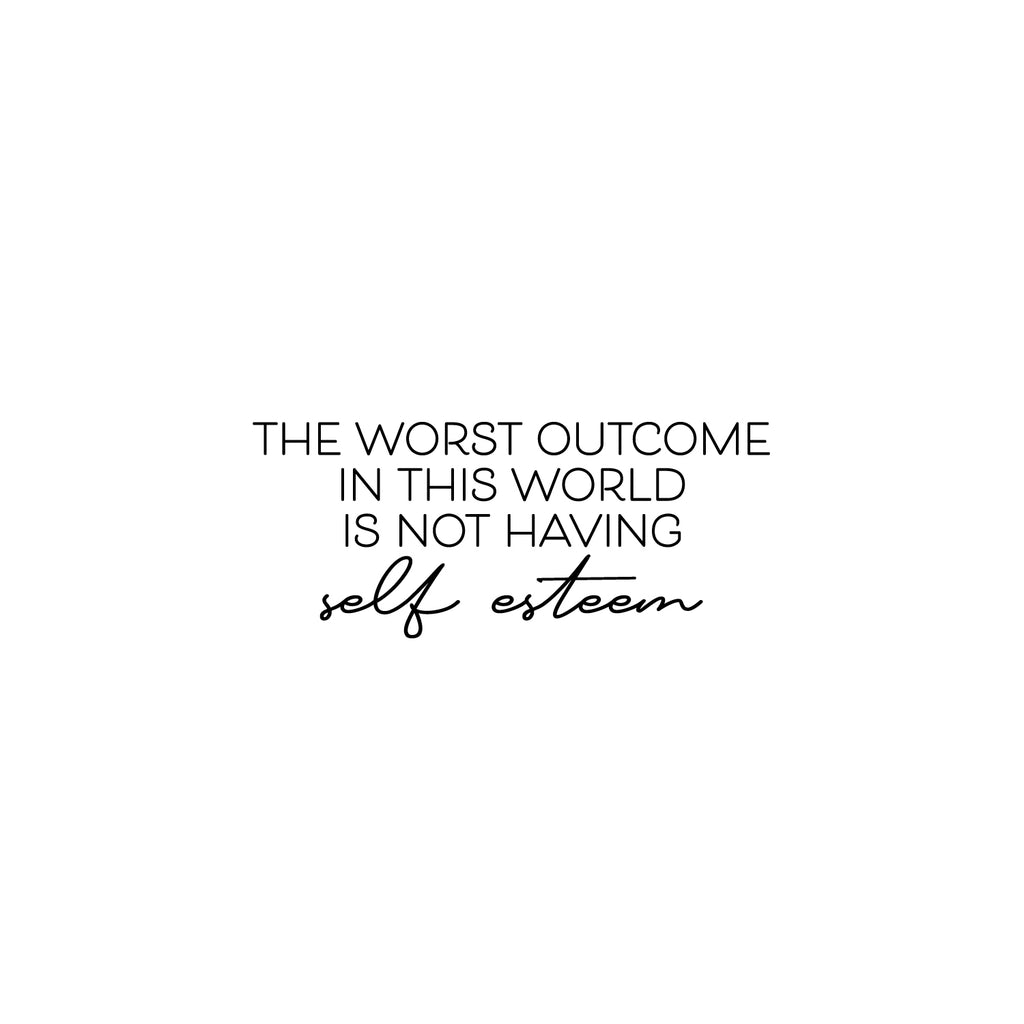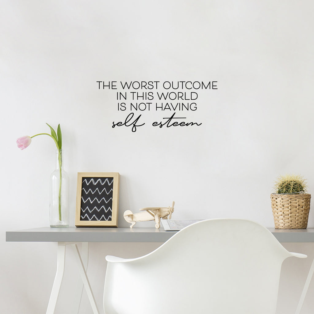 This motivational & optimistic decal quote "The Worst Outcome In This World Is Not Having Self Esteem"; is the perfect touch for your home or school. Use it for your living room; playroom; classroom or anywhere you want to bring some extra cute decoration. It's a vinyl sticker that is easy to put on any smooth and dry surface. Our modern designs don't just brighten up the room; but brighten up the day. Using top of the line vinyl across all of our production allows us to be the leaders in quality and design.