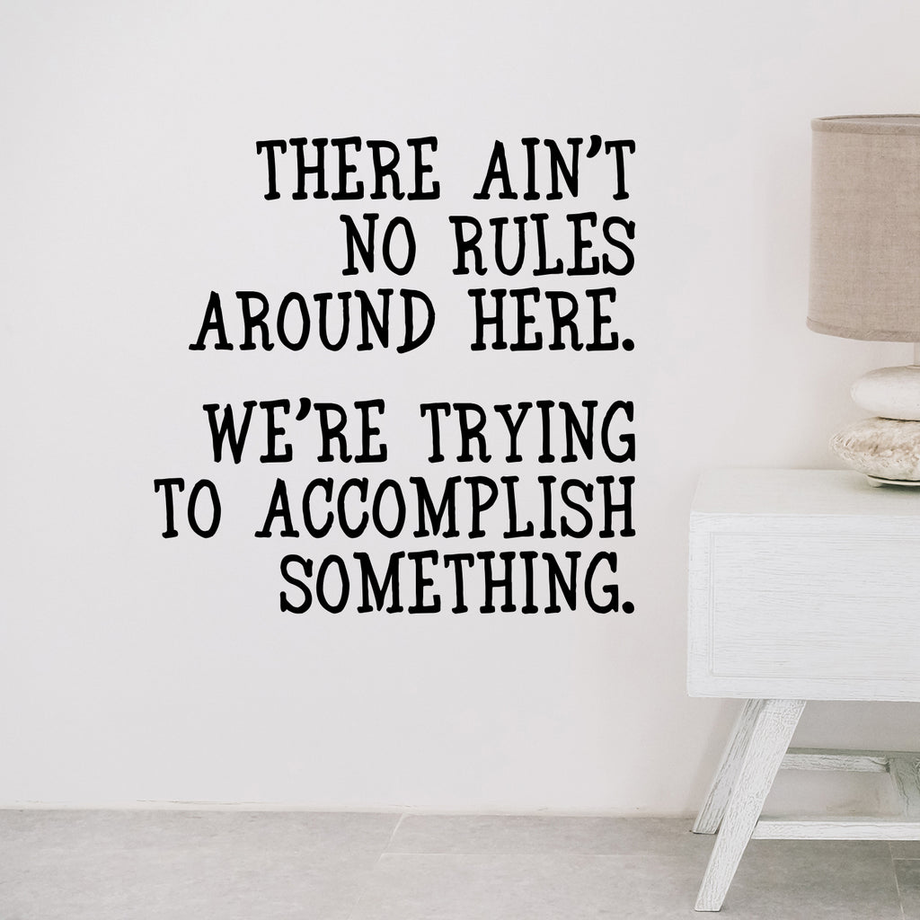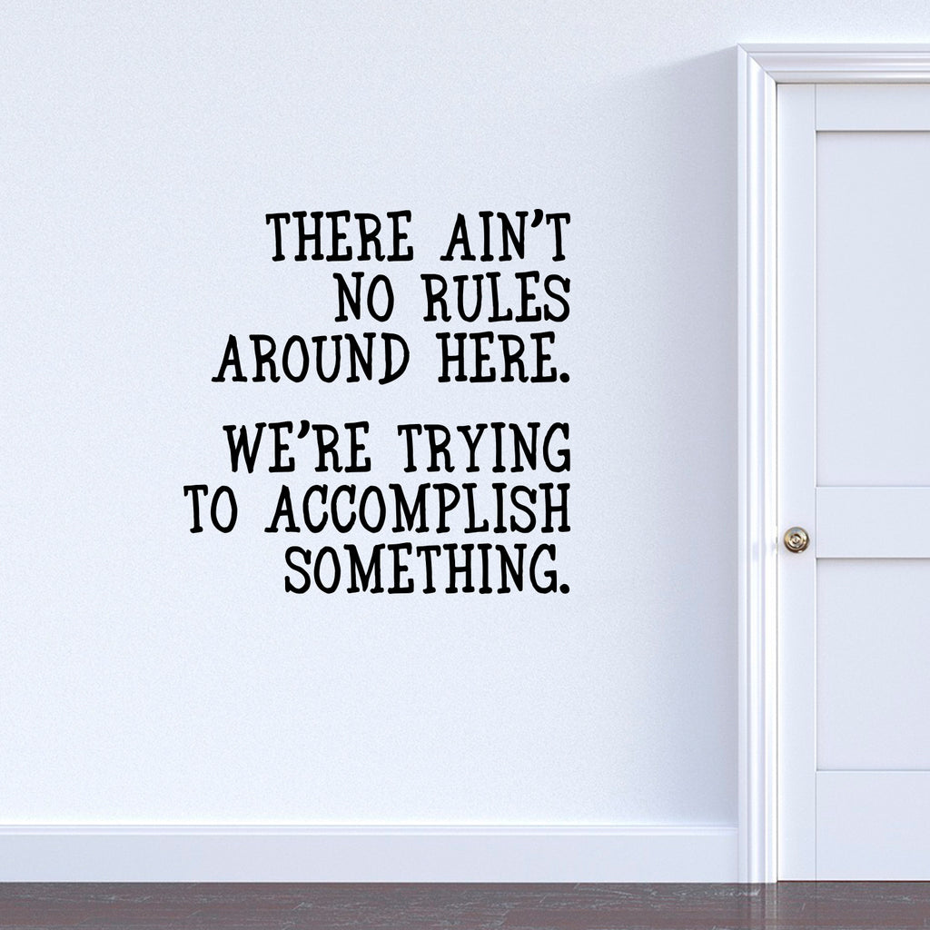 This motivating "There Ain’t No Rules Around Here; We’re trying to accomplish something" life quotes wall art decal is inspiring and the perfect touch for both indoor and outdoor decoration. It’s a vinyl sticker that is easy to put on almost any smooth surface and really brings a room together adding the perfect touch of decoration. This vinyl decal quote is perfect to inspire people to think outside the box in order to achieve their goals. Our inspiring quotes don’t just brighten up the room; but brighten up the day. Using top of the line vinyl across all of our production allows us to be the leaders in quality and design.The easiest surfaces for vinyl to stick on is Windows Walls Mirrors Dorm Rooms Cars Lockers Flat and Smooth Surfaces Tables and Glass CabinetsAll vinyl packages come with easy to follow instructions further explaining just how simple it is to apply vinyl on and off your surface of choice. Prior to applying the vinyl; be sure the surface is clean and oil free for best results. This vinyl is waterproof and is not permanent so it’s not only easy to use but easy to remove as well. In general; vinyl lettering is one of the latest and greatest trends in home decoration. Because our products are high quality; they give the illusion of painted wall art without the mess; cost; or time. What are you waiting for? Let’s get crafty!