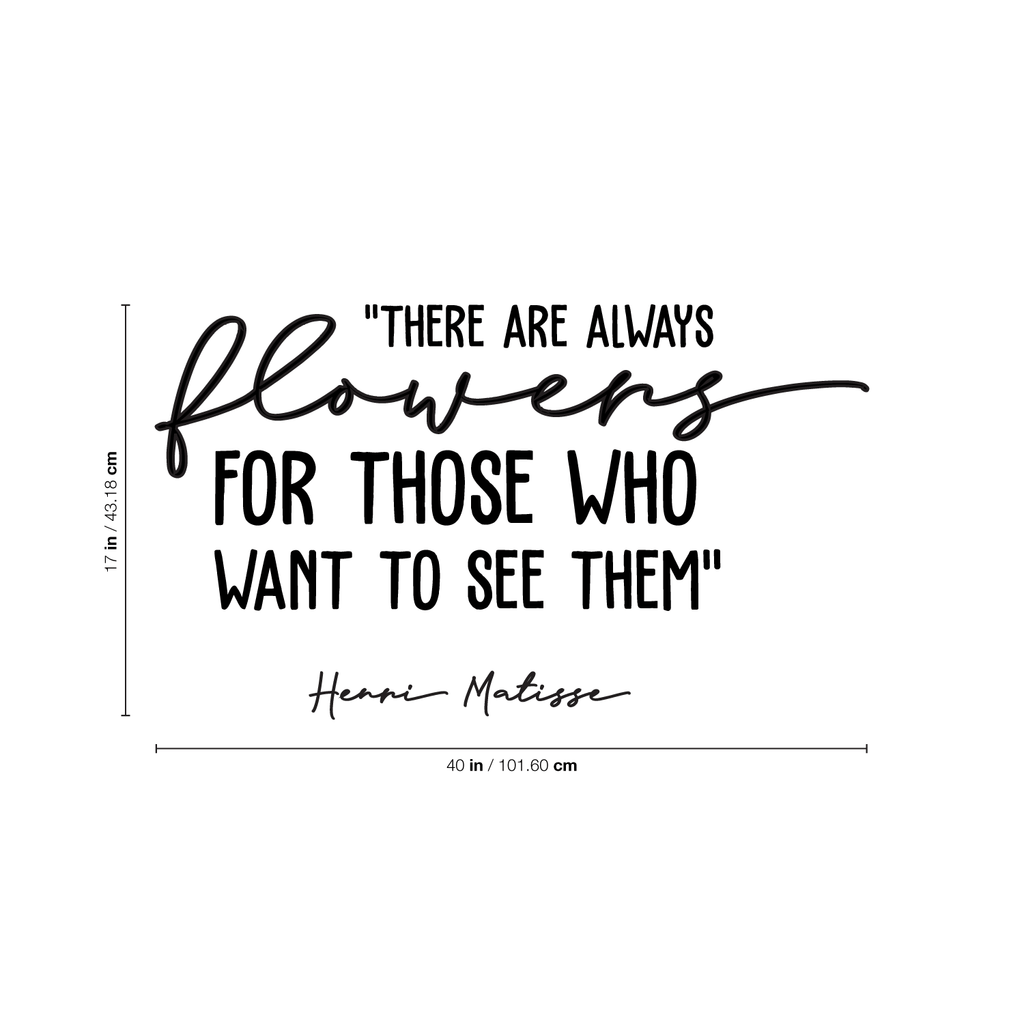 This awesome positive decal quote "There Are Always Flowers For Those Who Want To See Them - Henri Matisse"; is the perfect touch for your home or office. Use it for your playroom; kids room or anywhere you want to bring some extra optimistic decoration. It's a vinyl sticker that is easy to put on any smooth and dry surface. Our modern designs don't just brighten up the room; but brighten up the day. Using top of the line vinyl across all of our production allows us to be the leaders in quality and design.