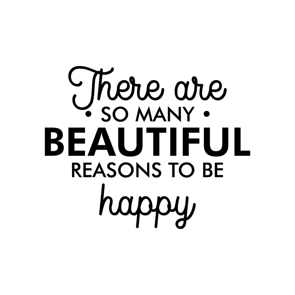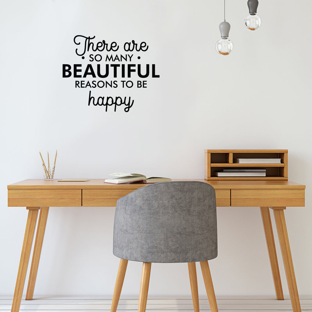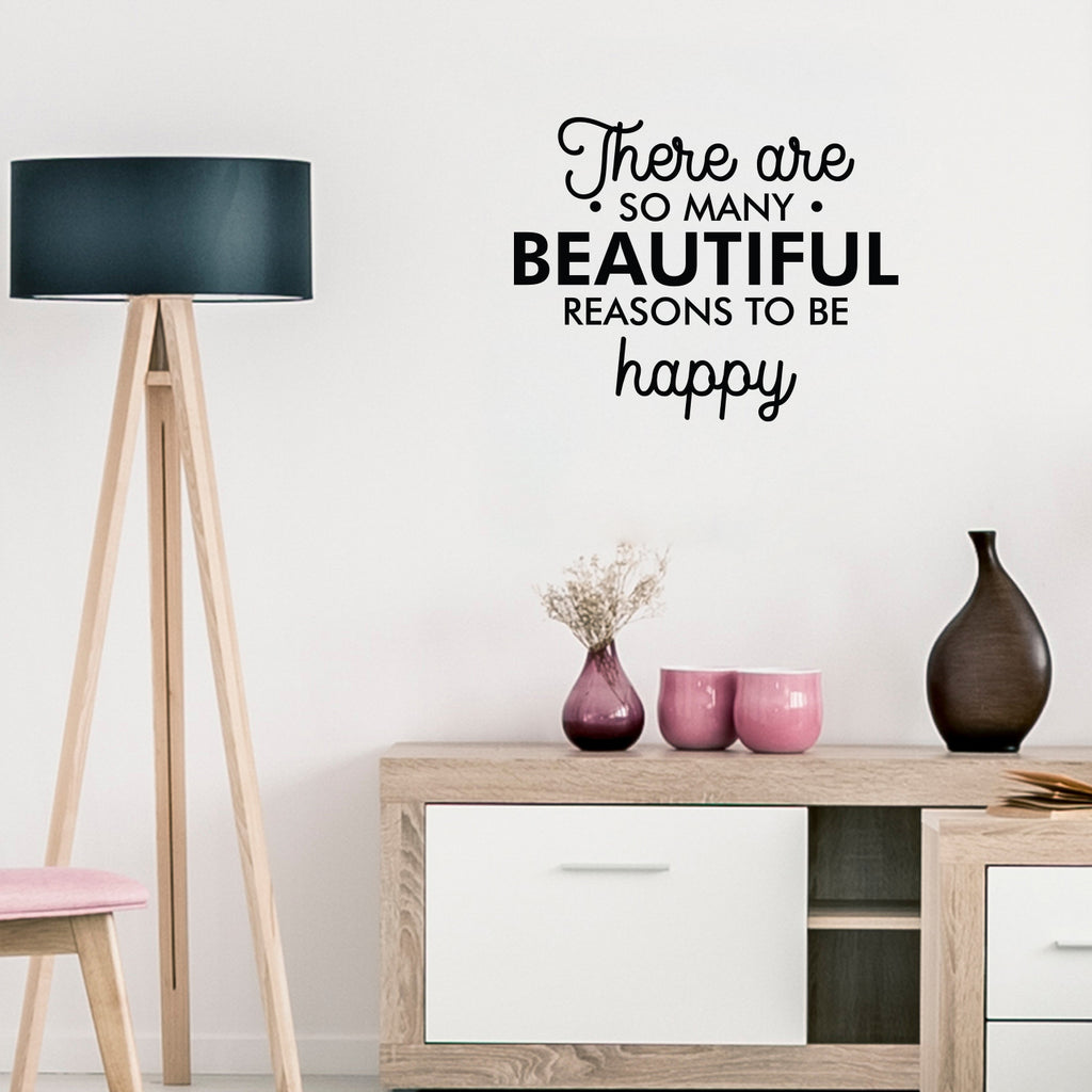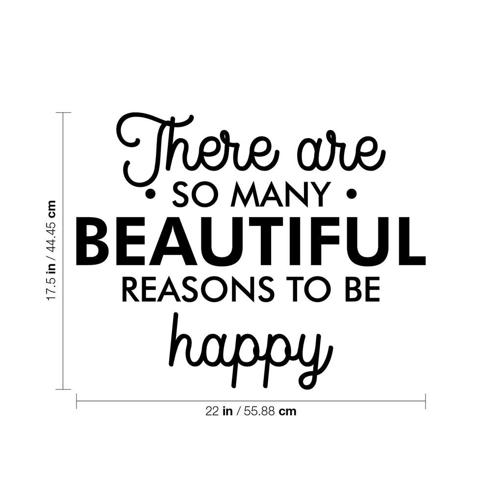 This awesome optimistic & motivational decal quote "There Are So Many Beautiful Reasons To Be Happy"; is the perfect touch for your gym or office. Use it for your living room; school; workout space or anywhere you want to bring some extra positive decoration. It's a vinyl sticker that is easy to put on any smooth and dry surface. Our modern designs don't just brighten up the room; but brighten up the day. Using top of the line vinyl across all of our production allows us to be the leaders in quality and design.