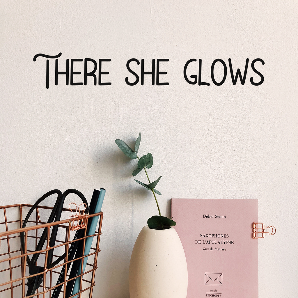 This awesome inspirational decal quote "There She Glows"; is the perfect touch for your home or apartment. Use it for your bedroom; living room; dorm room or anywhere you want to bring some extra decoration. It's a vinyl sticker that is easy to put on any smooth and dry surface. Our modern designs don't just brighten up the room; but brighten up the day. Using top of the line vinyl across all of our production allows us to be the leaders in quality and design.