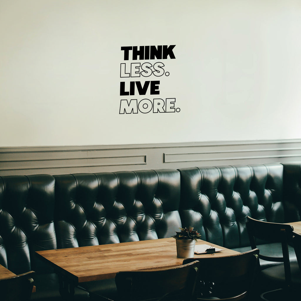 This trendy positive & motivational decal quote "Think Less Live More"; is the perfect touch for your office or home. Use it for your living room; coffee shop; classroom or anywhere you want to bring some extra positive decoration. It's a vinyl sticker that is easy to put on any smooth and dry surface. Our modern designs don't just brighten up the room; but brighten up the day. Using top of the line vinyl across all of our production allows us to be the leaders in quality and design.