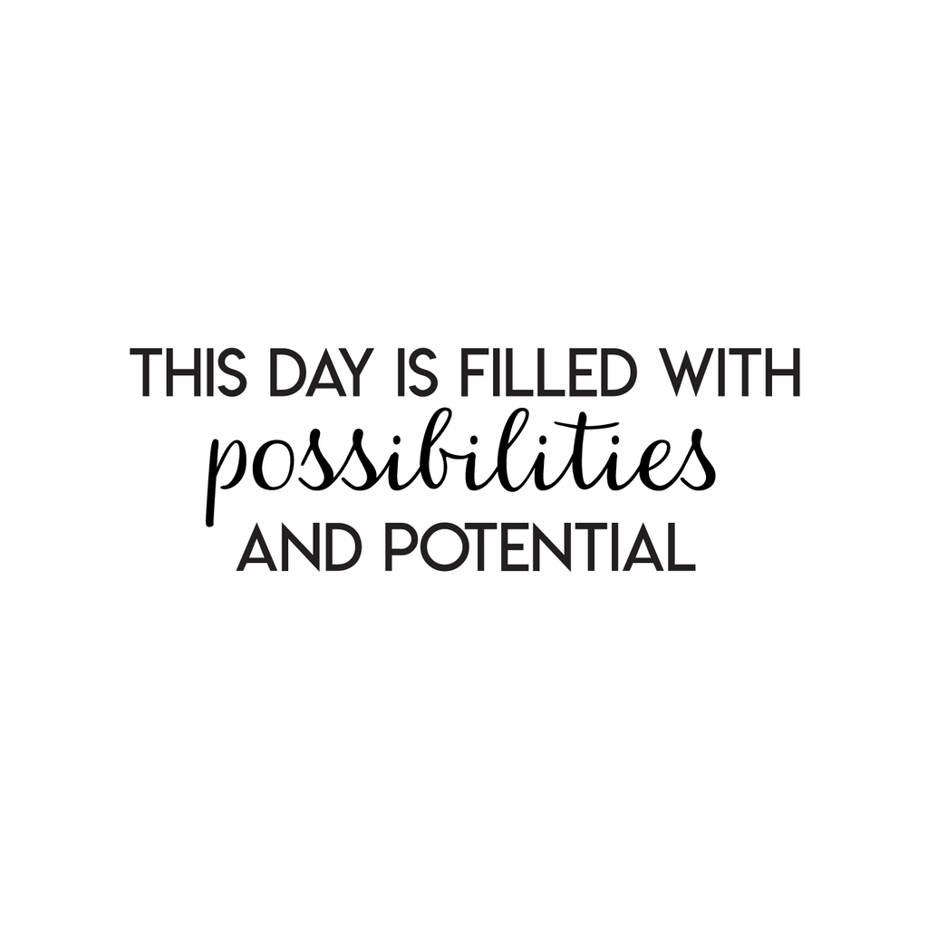 This trendy "This Day Is Filled With Possibilities And Potential" decal is the perfect touch for your home or office. Use it for your bedroom; living room; work; or anywhere you want to bring some extra decoration. It's a vinyl sticker that is easy to put on any smooth and dry surface. Our modern designs don't just brighten up the room; but brighten up the day. Using top of the line vinyl across all of our production allows us to be the leaders in quality and design.