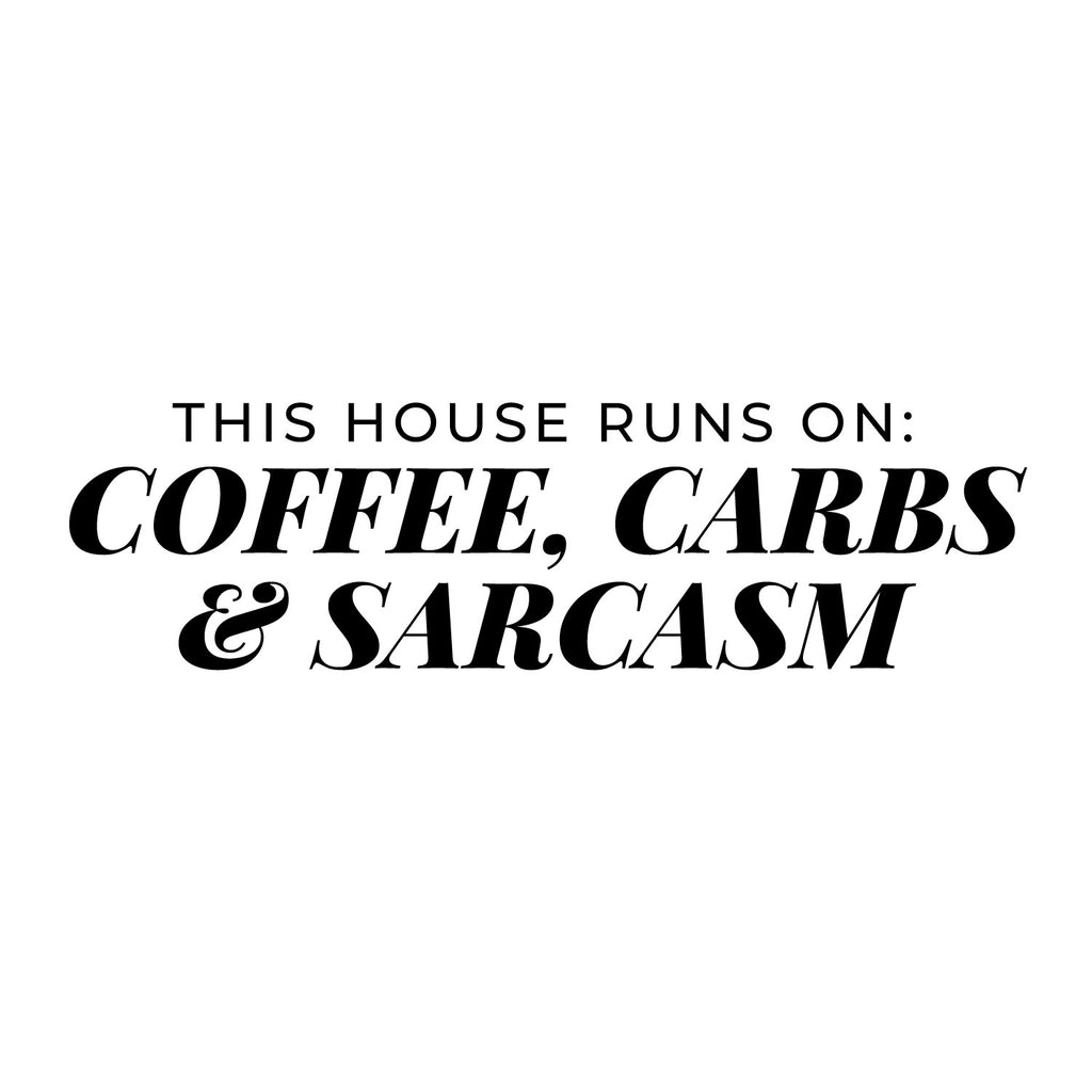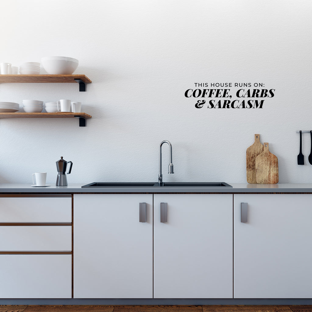 This awesome funny decal quote "This House Runs On Coffee Carbs And Sarcasm"; is the perfect touch for your office or coffee shop. Use it for your dining room; restaurant; kitchen or anywhere you want to bring some extra fun decoration. It's a vinyl sticker that is easy to put on any smooth and dry surface. Our modern designs don't just brighten up the room; but brighten up the day. Using top of the line vinyl across all of our production allows us to be the leaders in quality and design.