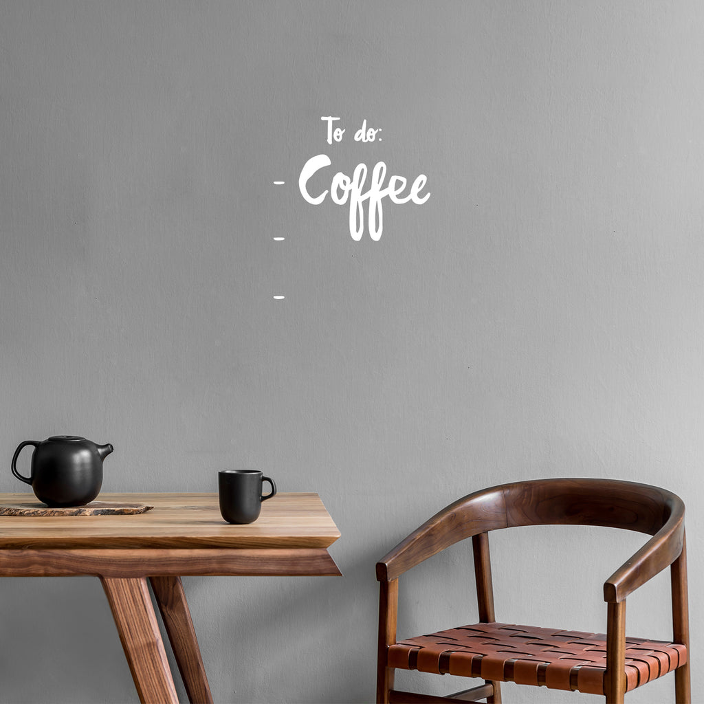 This awesome funny & inspiring decal quote "To Do: - Coffee"; is the perfect touch for your office or coffee shop. Use it for your dining room; restaurant; kitchen or anywhere you want to bring some extra fun decoration. It's a vinyl sticker that is easy to put on any smooth and dry surface. Our modern designs don't just brighten up the room; but brighten up the day. Using top of the line vinyl across all of our production allows us to be the leaders in quality and design.