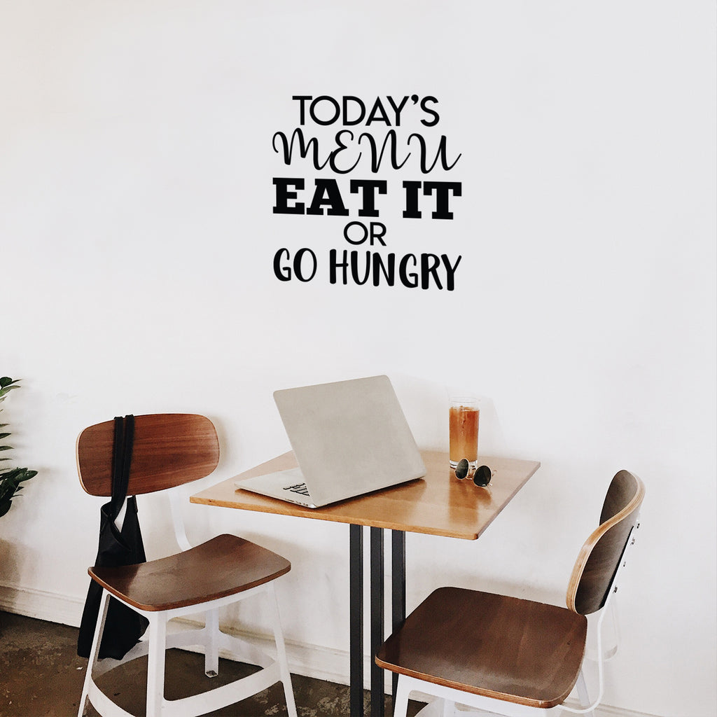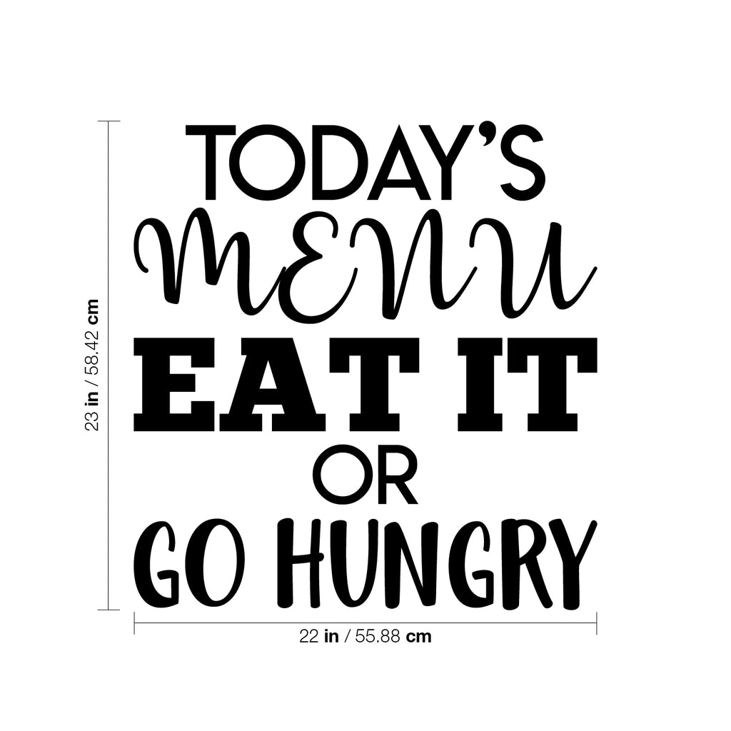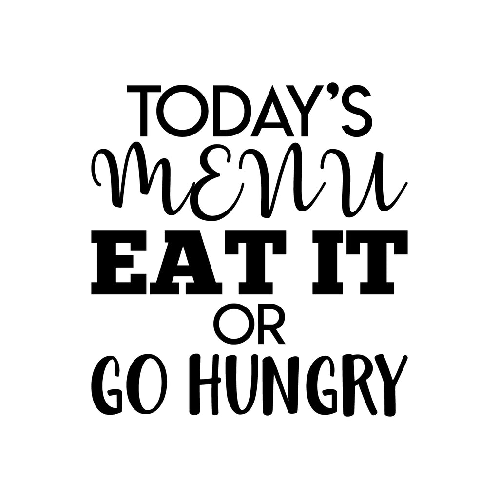 This awesome cute decal quote "Today's Menu Eat It Or Go Hungry"; is the perfect touch for your home or apartment. Use it for your kitchen; dining room or anywhere you want to bring some extra decoration. It's a vinyl sticker that is easy to put on any smooth and dry surface. Our modern designs don't just brighten up the room; but brighten up the day. Using top of the line vinyl across all of our production allows us to be the leaders in quality and design.