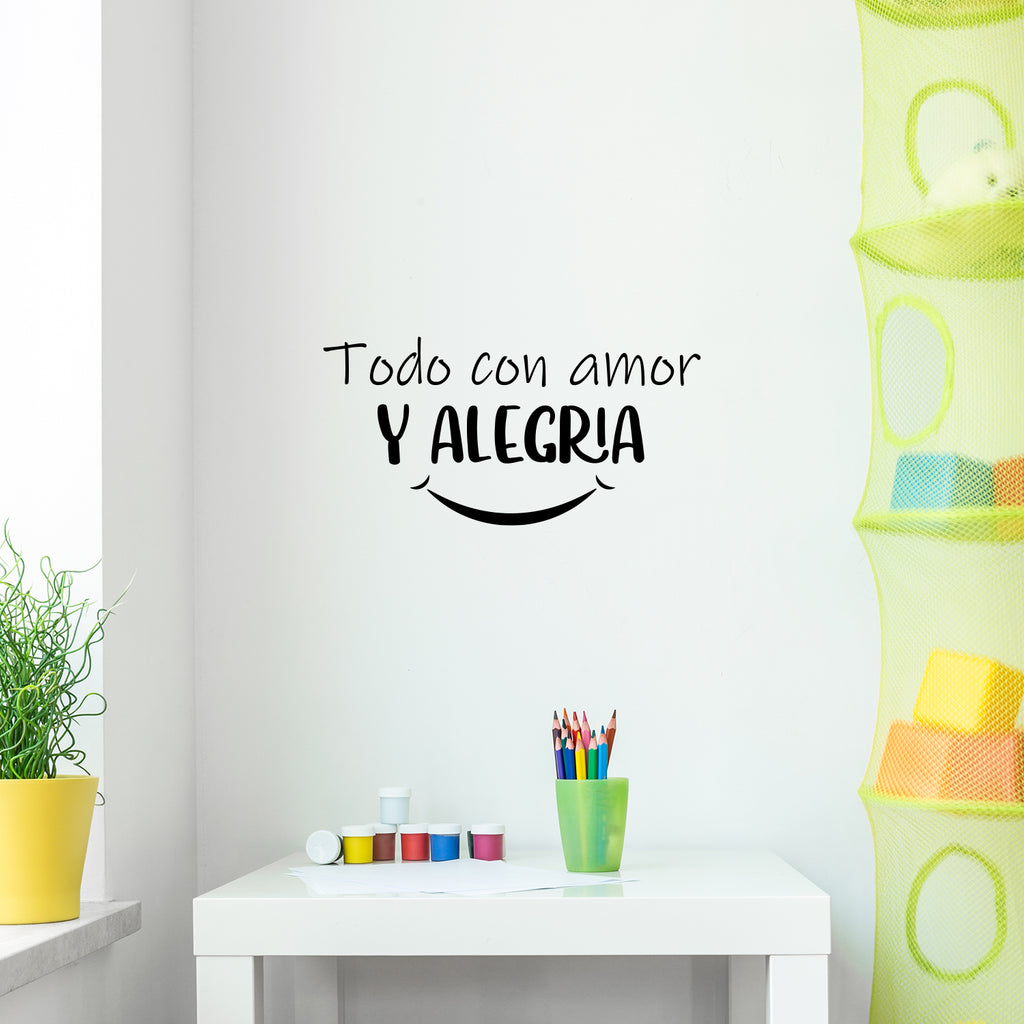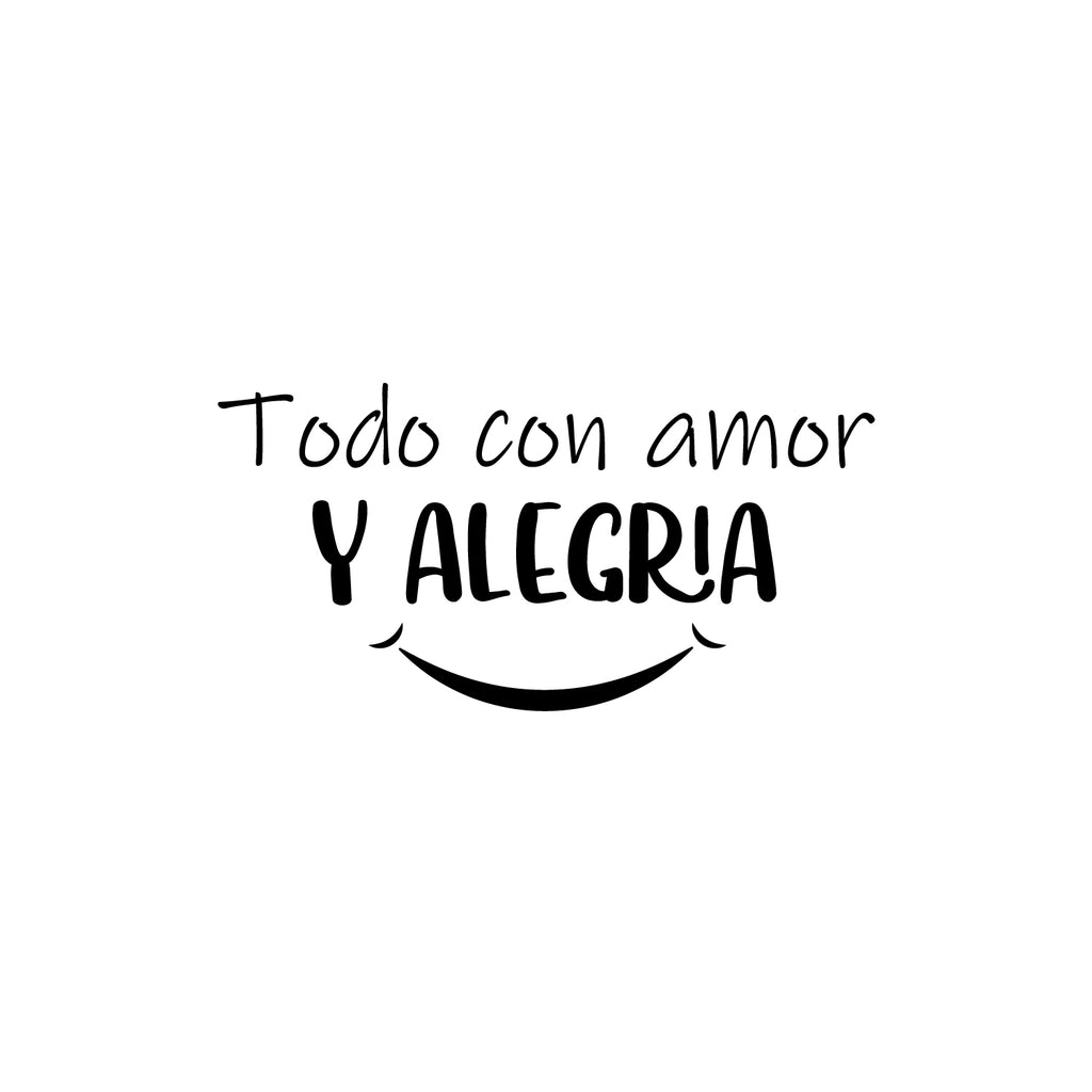 This awesome positive decal quote "Todo Con Amor Y Alegria / Everything With Love And Joy" is the perfect touch for your home or office. Use it for your bedroom; living room; coffee shop or anywhere you want to bring some extra cute decoration. It's a vinyl sticker that is easy to put on any smooth and dry surface. Our modern designs don't just brighten up the room; but brighten up the day. Using top of the line vinyl across all of our production allows us to be the leaders in quality and design.
