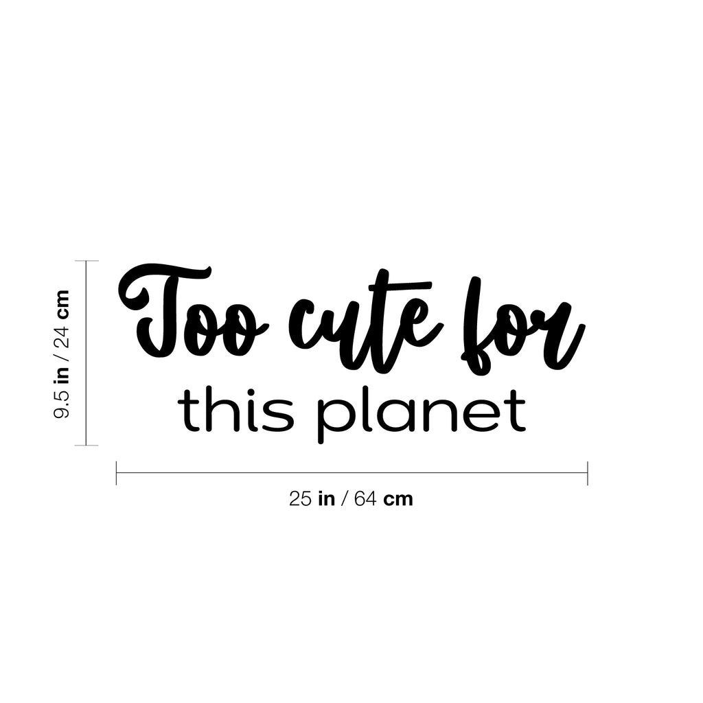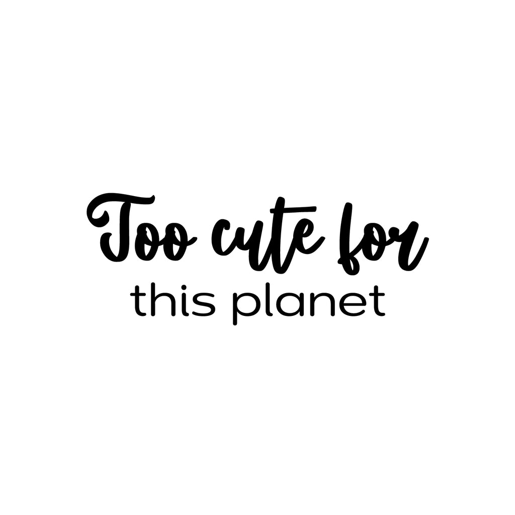 This awesome lovely decal quote "Too Cute For This Planet" is the perfect touch for your home. Use it for your nursery; playroom; kids room or anywhere you want to bring some extra cute decoration. It's a vinyl sticker that is easy to put on any smooth and dry surface. Our modern designs don't just brighten up the room; but brighten up the day. Using top of the line vinyl across all of our production allows us to be the leaders in quality and design.