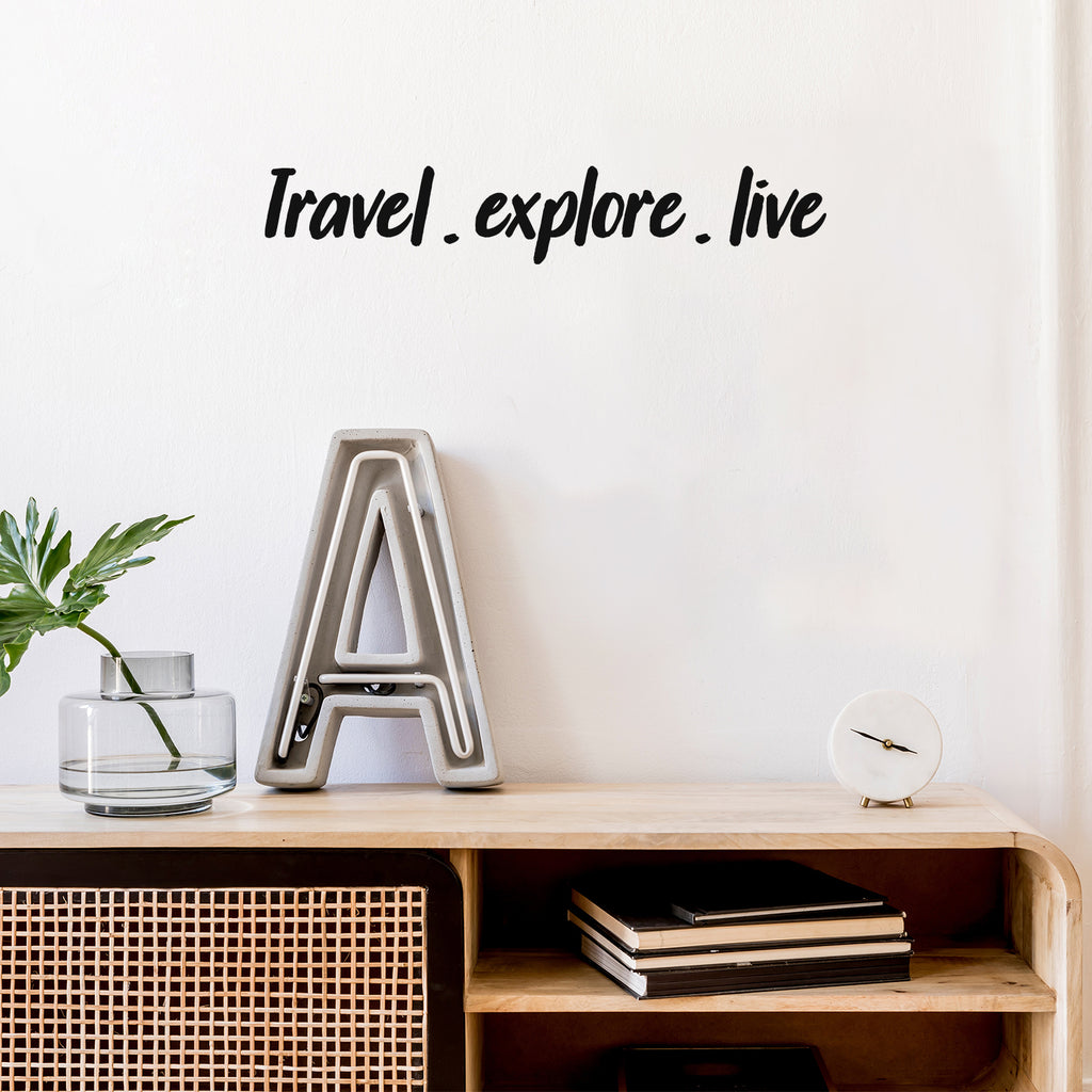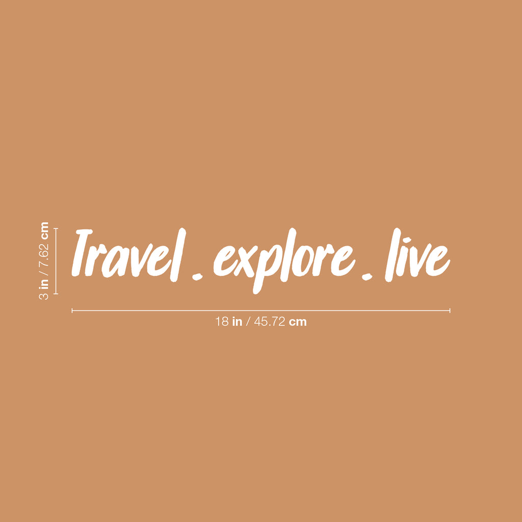 This awesome optimistic & inspirational decal quote "Travel Explore Live"; is the perfect touch for your home or office. Use it for your home school; living room; office or anywhere you want to bring some extra decoration. It's a vinyl sticker that is easy to put on any smooth and dry surface. Our modern designs don't just brighten up the room; but brighten up the day. Using top of the line vinyl across all of our production allows us to be the leaders in quality and design.