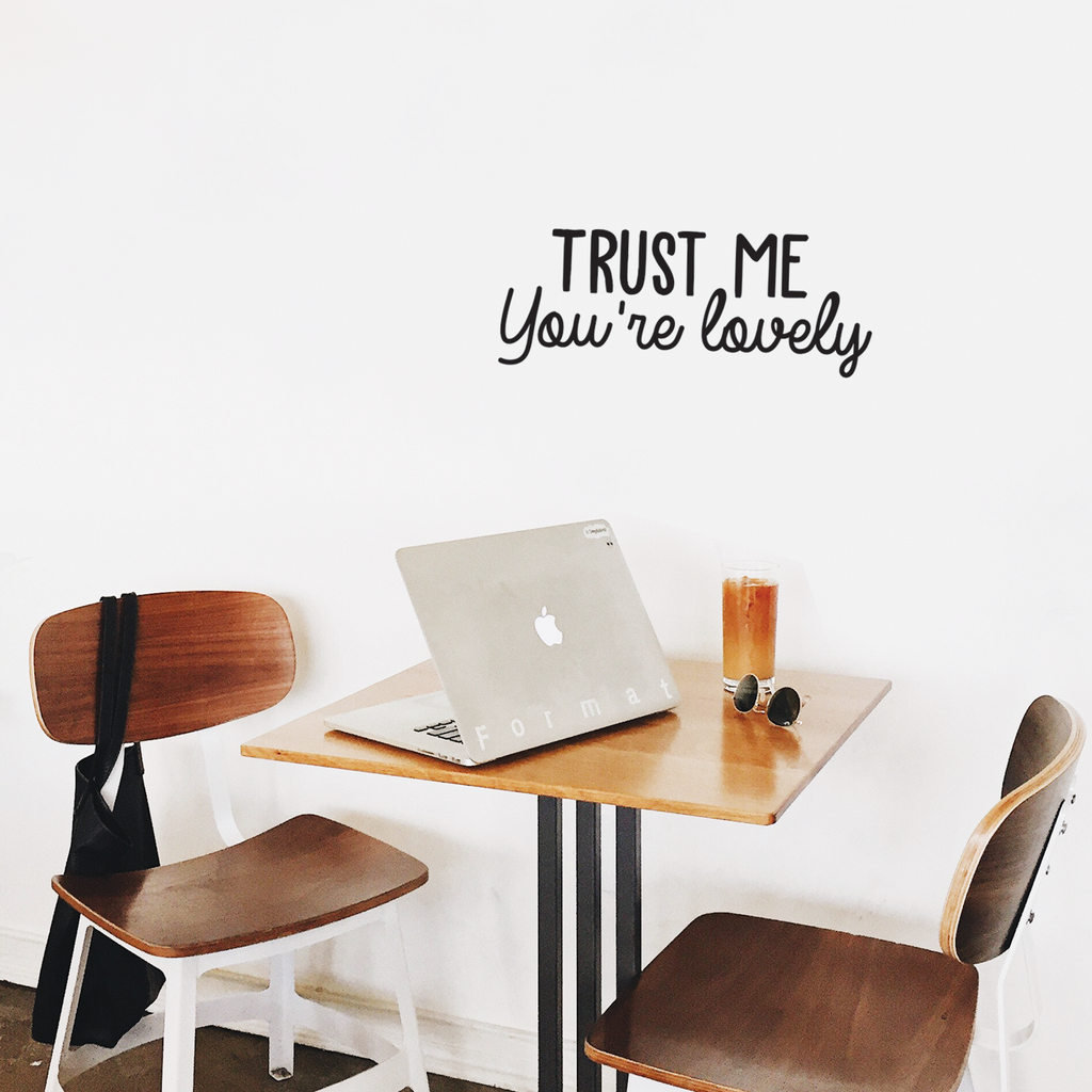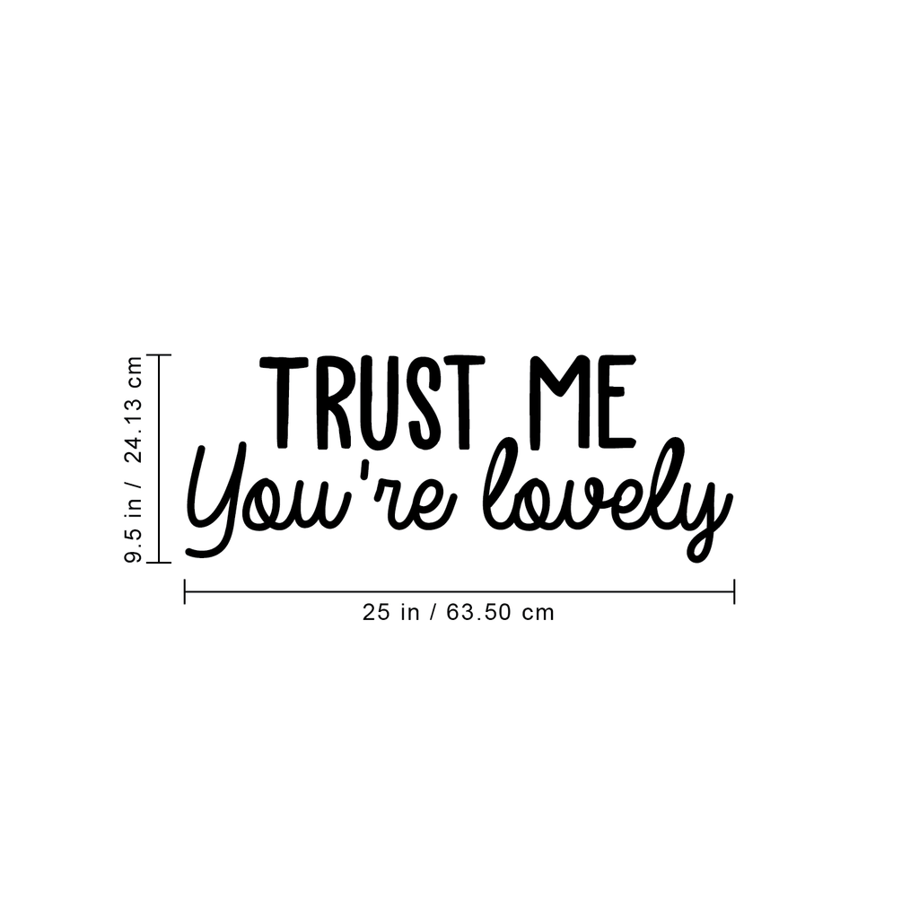 This awesome decal quote "Trust Me You're Lovely"; is the perfect touch for your home or workplace. Use it for your bedroom; living room; office or anywhere you want to bring some extra decoration. It's a vinyl sticker that is easy to put on any smooth and dry surface. Our modern designs don't just brighten up the room; but brighten up the day. Using top of the line vinyl across all of our production allows us to be the leaders in quality and design.