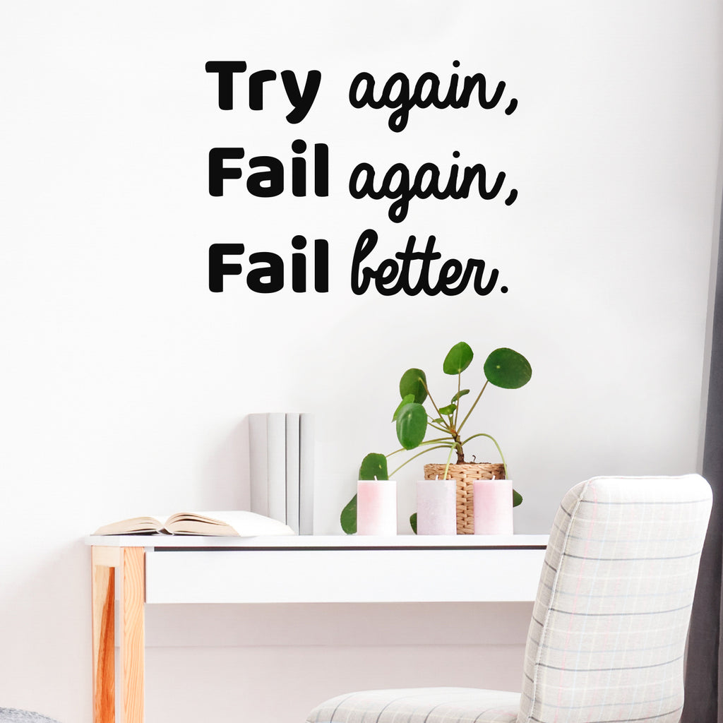 This awesome inspirational decal quote "Try Again; Fail Again; Fail Better."; is the perfect touch for your home or classroom. Use it for your home school; living room; office or anywhere you want to bring some extra decoration. It's a vinyl sticker that is easy to put on any smooth and dry surface. Our modern designs don't just brighten up the room; but brighten up the day. Using top of the line vinyl across all of our production allows us to be the leaders in quality and design.