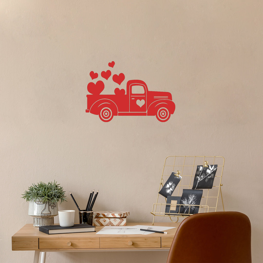 This awesome cute design decal quote "Valentines Truck Hearts"; is the perfect touch for your home. Use it for your makeup area; dorm room or anywhere you want to bring some extra decoration. It's a vinyl sticker that is easy to put on any smooth and dry surface. Our modern designs don't just brighten up the room; but brighten up the day. Using top of the line vinyl across all of our production allows us to be the leaders in quality and design.