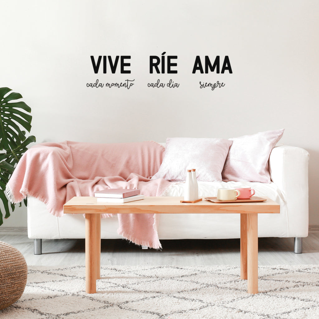 This inspirational & cute decal quote "Vive Cada Momento. Rie Cada Dia. Ama Siempre. / Live Every Moment. Laugh Every Day. Love Always."; is the perfect touch for your home or school. Use it for your living room; playroom; kids room or anywhere you want to bring some extra cute decoration. It's a vinyl sticker that is easy to put on any smooth and dry surface. Our modern designs don't just brighten up the room; but brighten up the day. Using top of the line vinyl across all of our production allows us to be the leaders in quality and design.