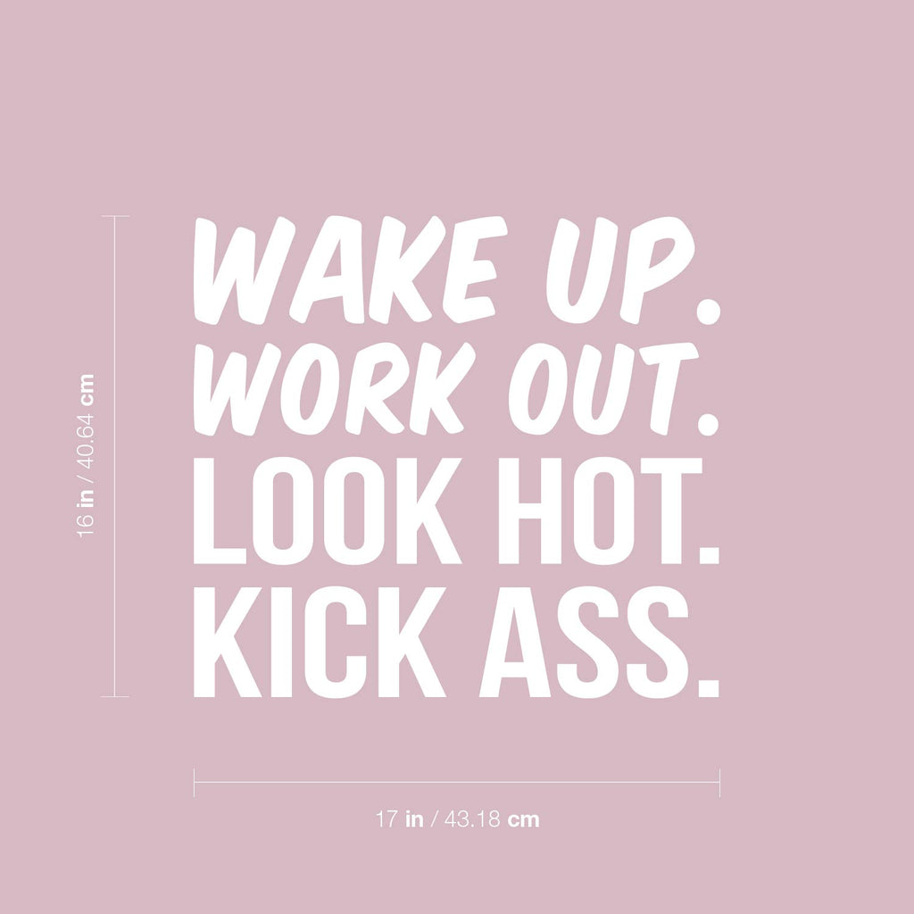 This awesome optimistic & motivational decal quote "Wake Up. Work Out. Look Hot. Kick Ass"; is the perfect touch for your gym or office. Use it for your living room; school; workout space or anywhere you want to bring some extra positive decoration. It's a vinyl sticker that is easy to put on any smooth and dry surface. Our modern designs don't just brighten up the room; but brighten up the day. Using top of the line vinyl across all of our production allows us to be the leaders in quality and design.
