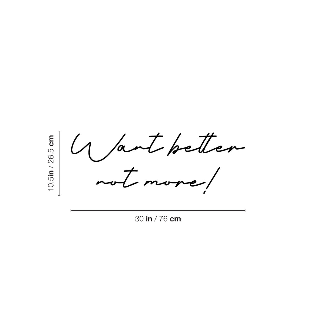 This awesome inspiring decal quote "Want Better Not More"; is the perfect touch for your fitness center or home. Use it for your wellness clinic; healthy center; storefront or anywhere you want to bring some extra positive decoration. It's a vinyl sticker that is easy to put on any smooth and dry surface. Our modern designs don't just brighten up the room; but brighten up the day. Using top of the line vinyl across all of our production allows us to be the leaders in quality and design.