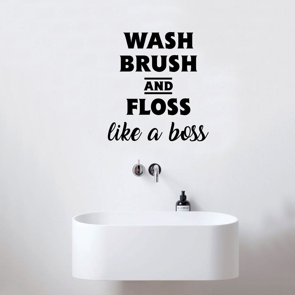 This modern "Wash Brush And Floss Like A Boss" life quotes wall art decal is trendy and the perfect touch for both indoor and outdoor decoration. It’s a vinyl sticker that is easy to put on almost any smooth surface and really brings a room together adding the perfect touch of decoration. This vinyl decal quote is perfect to put in a bathroom for your home or in a guest bathroom. Our modern quotes don’t just brighten up the room; but brighten up the day. Using top of the line vinyl across all of our production allows us to be the leaders in quality and design.The easiest surfaces for vinyl to stick on is Windows Walls Mirrors Dorm Rooms Cars Lockers Flat and Smooth Surfaces Tables and Glass CabinetsAll vinyl packages come with easy to follow instructions further explaining just how simple it is to apply vinyl on and off your surface of choice. Prior to applying the vinyl; be sure the surface is clean and oil free for best results. This vinyl is waterproof and is not permanent so it’s not only easy to use but easy to remove as well. In general; vinyl lettering is one of the latest and greatest trends in home decoration. Because our products are high quality; they give the illusion of painted wall art without the mess; cost; or time. What are you waiting for? Let’s get crafty!