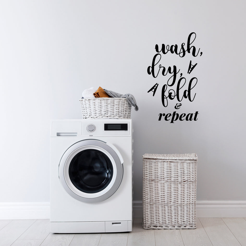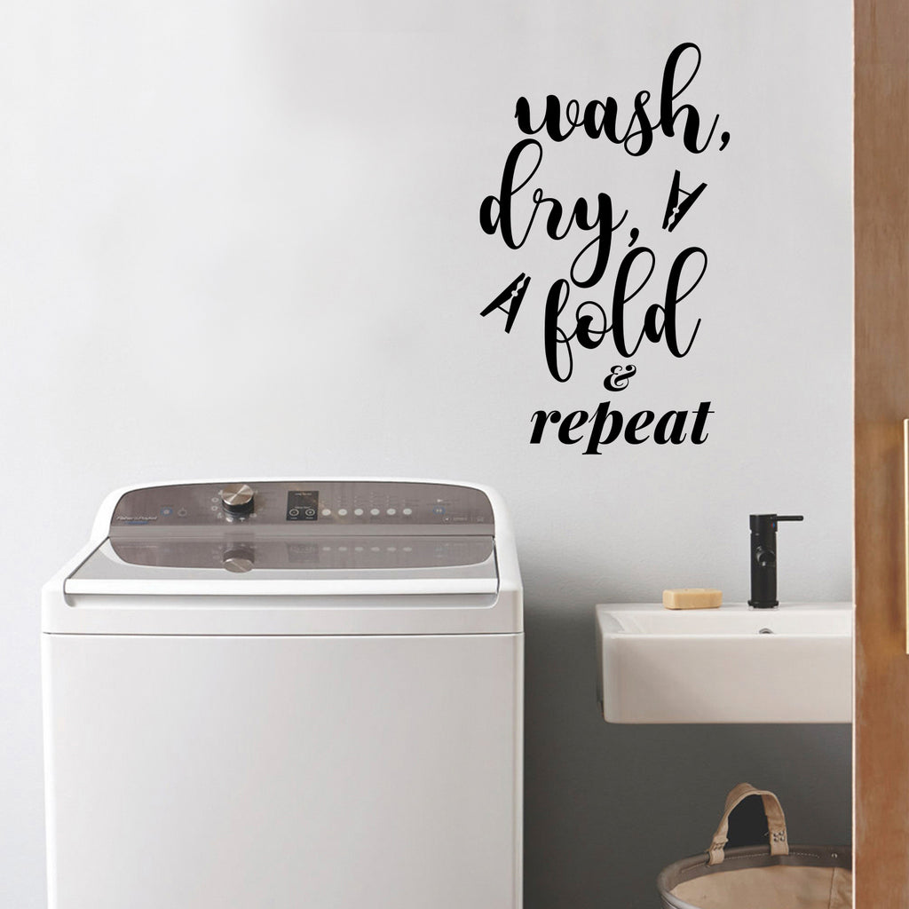 This awesome fun & positive decal quote "Wash Dry Fold & Repeat"; is the perfect touch for your home. Use it for your bathroom; laundry room; washing space or anywhere you want to bring some extra positive decoration. It's a vinyl sticker that is easy to put on any smooth and dry surface. Our modern designs don't just brighten up the room; but brighten up the day. Using top of the line vinyl across all of our production allows us to be the leaders in quality and design.