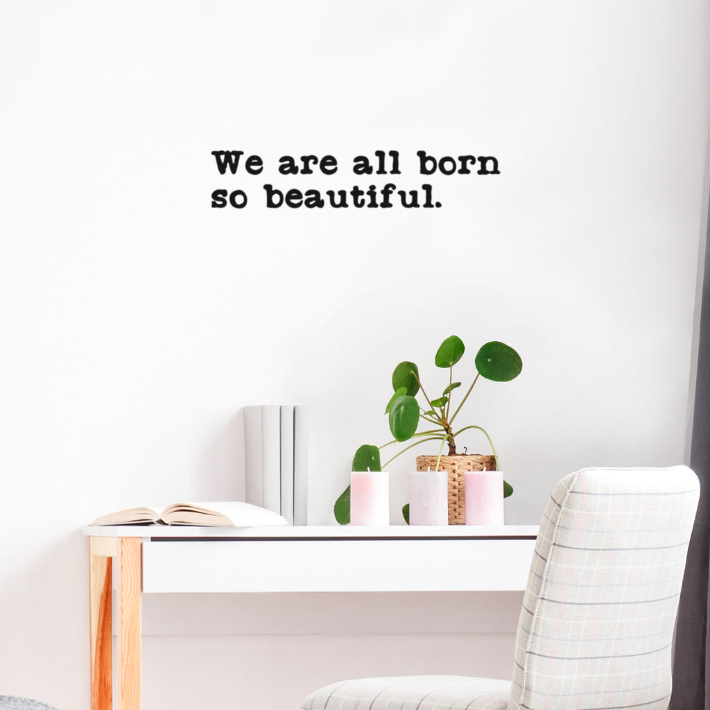 This great decal quote "We Are All Born So Beautiful"; is the perfect touch for your home. Use it for your kids room; living room or anywhere you want to bring some extra decoration. It's a vinyl sticker that is easy to put on any smooth and dry surface. Our modern designs don't just brighten up the room; but brighten up the day. Using top of the line vinyl across all of our production allows us to be the leaders in quality and design.