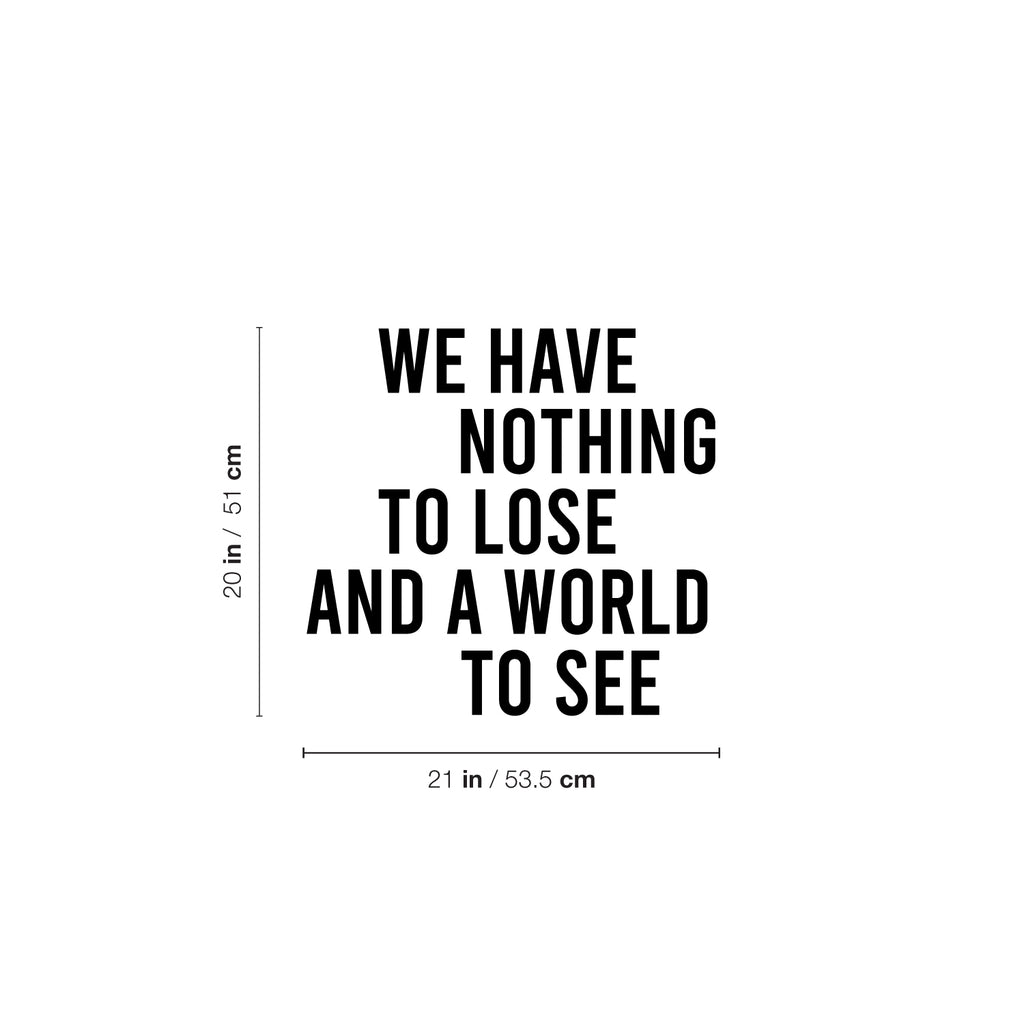 This awesome positive decal quote "We Have Nothing To Lose And A World To See"; is the perfect touch for your home or office. Use it for your gym storefront; coffee shop or anywhere you want to bring some extra inspiring decoration. It's a vinyl sticker that is easy to put on any smooth and dry surface. Our modern designs don't just brighten up the room; but brighten up the day. Using top of the line vinyl across all of our production allows us to be the leaders in quality and design.