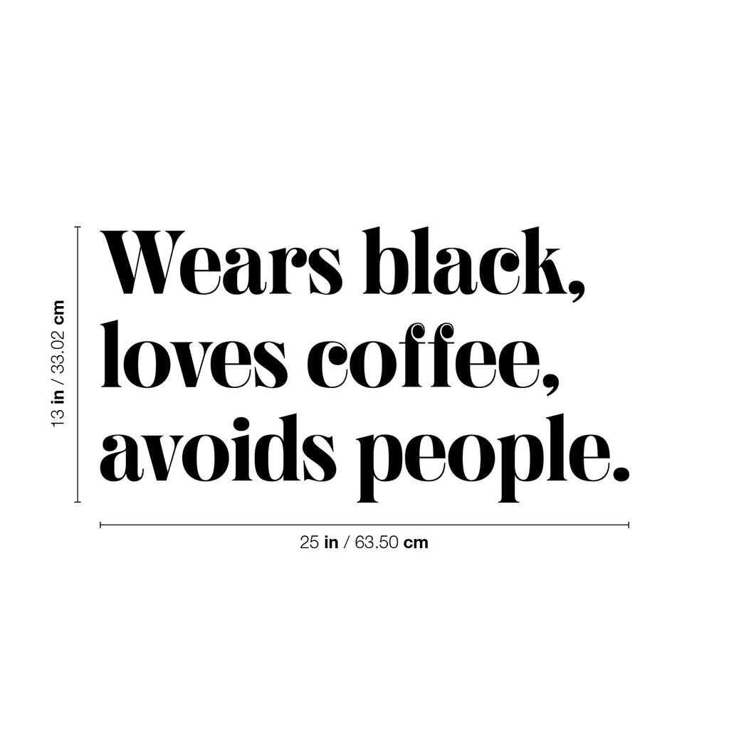This awesome cute & lovely decal quote "Wears Black; Loves Coffee; Avoids People."; is the perfect touch for your home or school. Use it for your living room; playroom; office or anywhere you want to bring some extra cute decoration. It's a vinyl sticker that is easy to put on any smooth and dry surface. Our modern designs don't just brighten up the room; but brighten up the day. Using top of the line vinyl across all of our production allows us to be the leaders in quality and design.