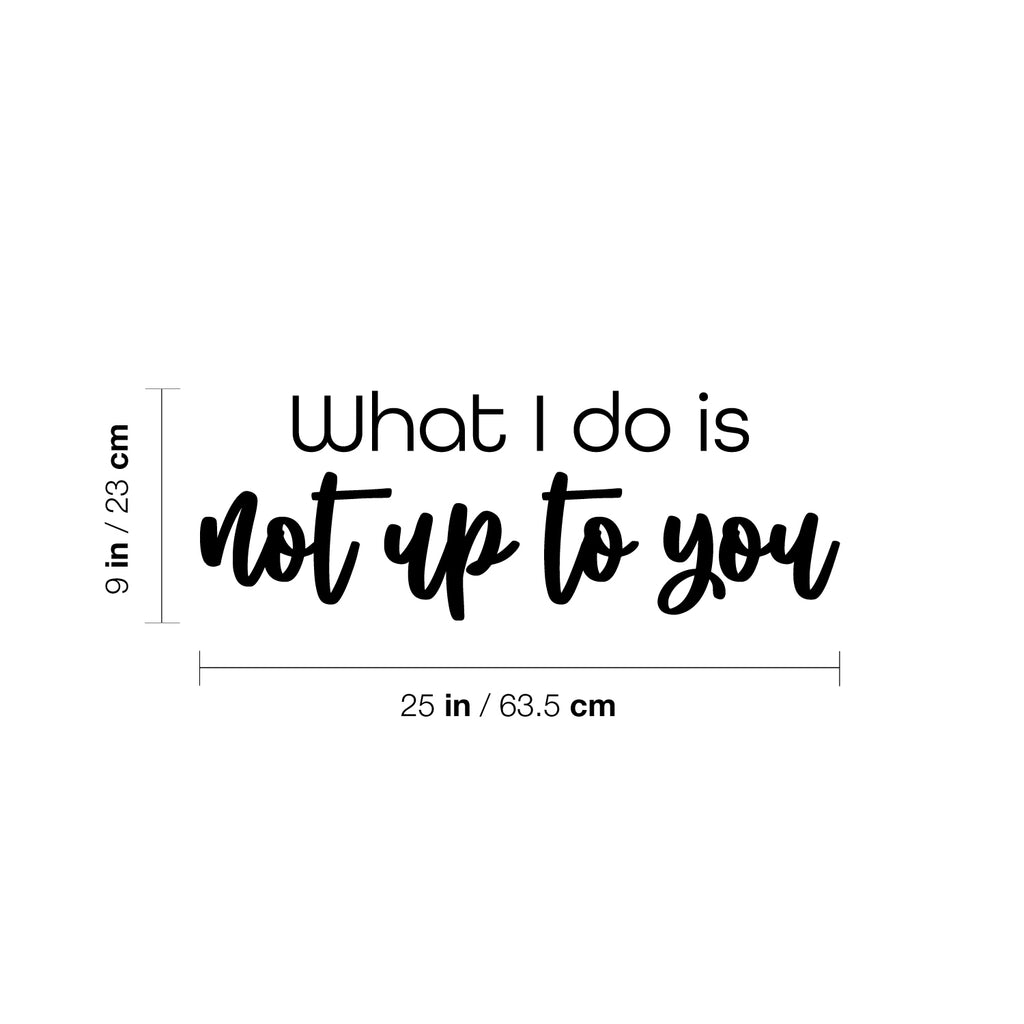 This awesome funny decal quote "What I Do Is Not Up To You"; is the perfect touch for your home or office. Use it for your store; coffee shop or anywhere you want to bring some extra fun decoration. It's a vinyl sticker that is easy to put on any smooth and dry surface. Our modern designs don't just brighten up the room; but brighten up the day. Using top of the line vinyl across all of our production allows us to be the leaders in quality and design.