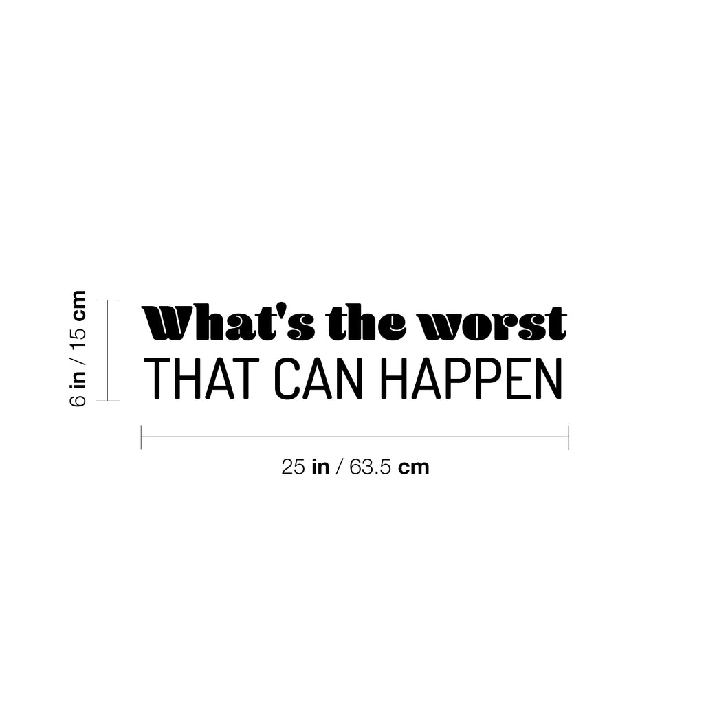 This awesome fun & positive decal quote "What's The Worst That Can Happen"; is the perfect touch for your home or school. Use it for your classroom; playroom or anywhere you want to bring some extra inspiring decoration. It's a vinyl sticker that is easy to put on any smooth and dry surface. Our modern designs don't just brighten up the room; but brighten up the day. Using top of the line vinyl across all of our production allows us to be the leaders in quality and design.