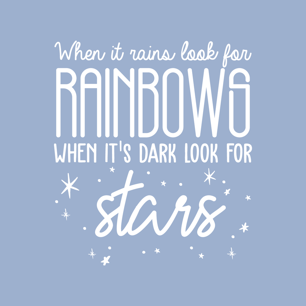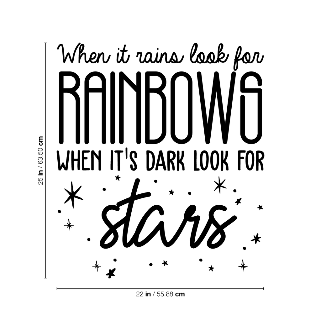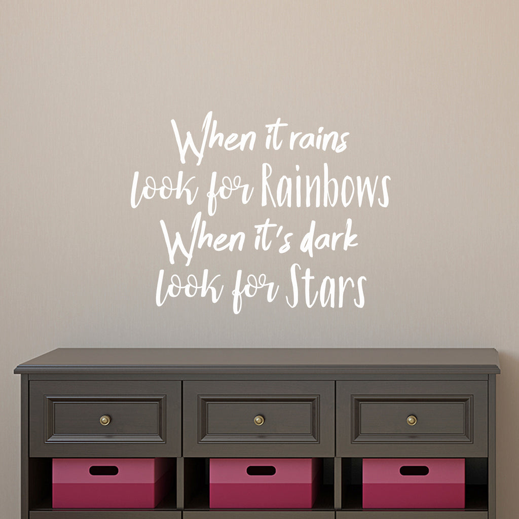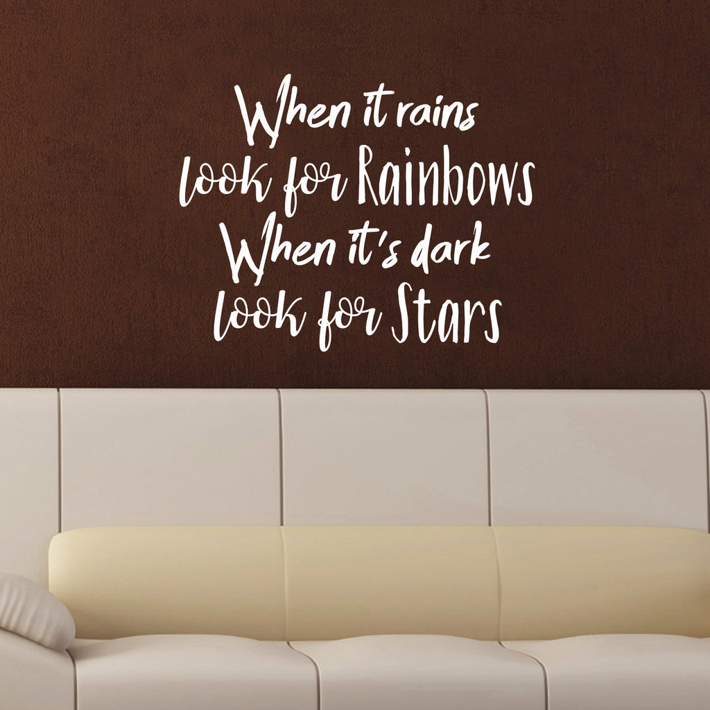 This cute decal "When It Rains Look For Rainbows When It's Dark Look For Stars"; is the perfect touch for your home or apartment. Use it for your home; bedroom; dorm room or anywhere you want to bring some extra inspirational decoration. It's a vinyl sticker that is easy to put on any smooth and dry surface. Our modern designs don't just brighten up the room; but brighten up the day. Using top of the line vinyl across all of our production allows us to be the leaders in quality and design.