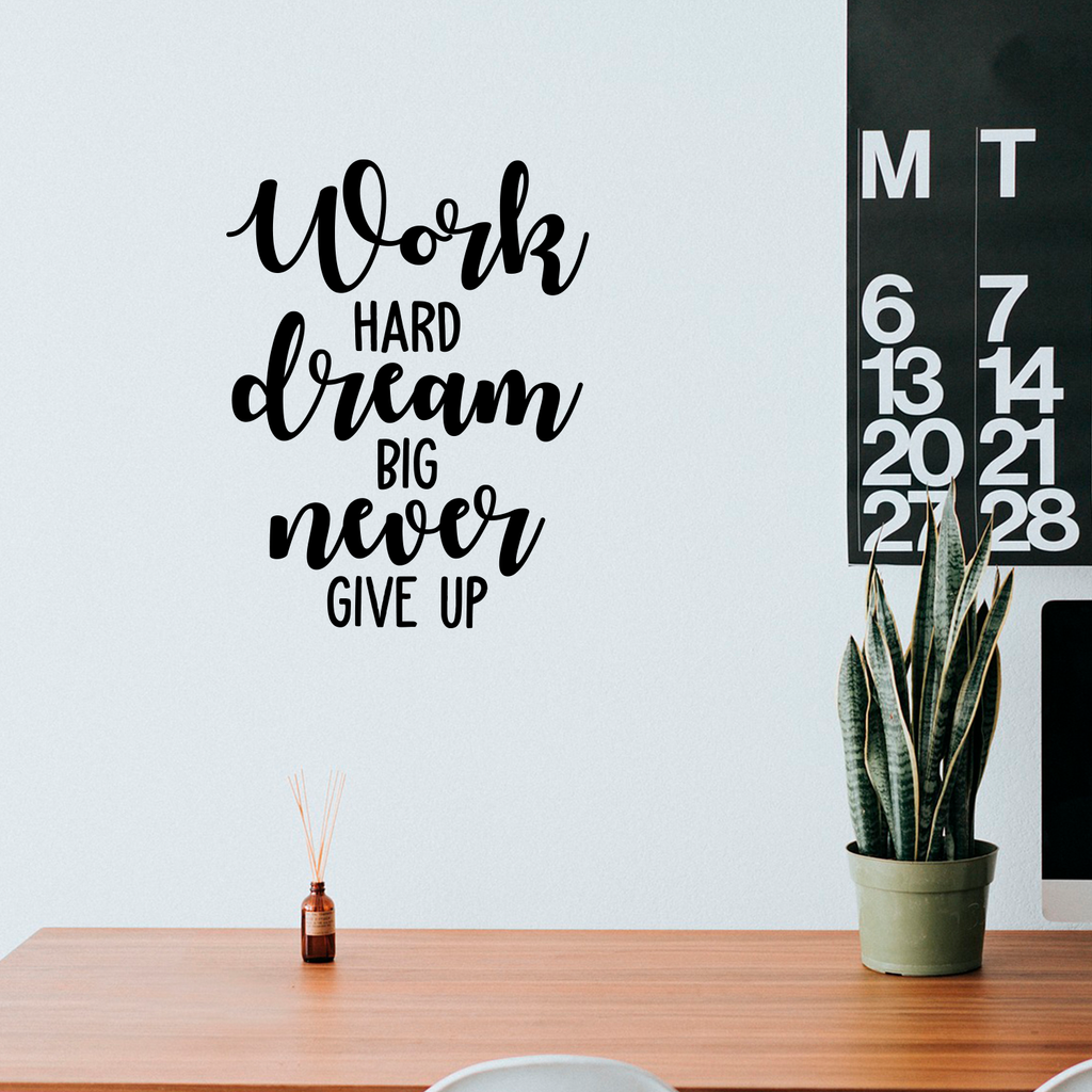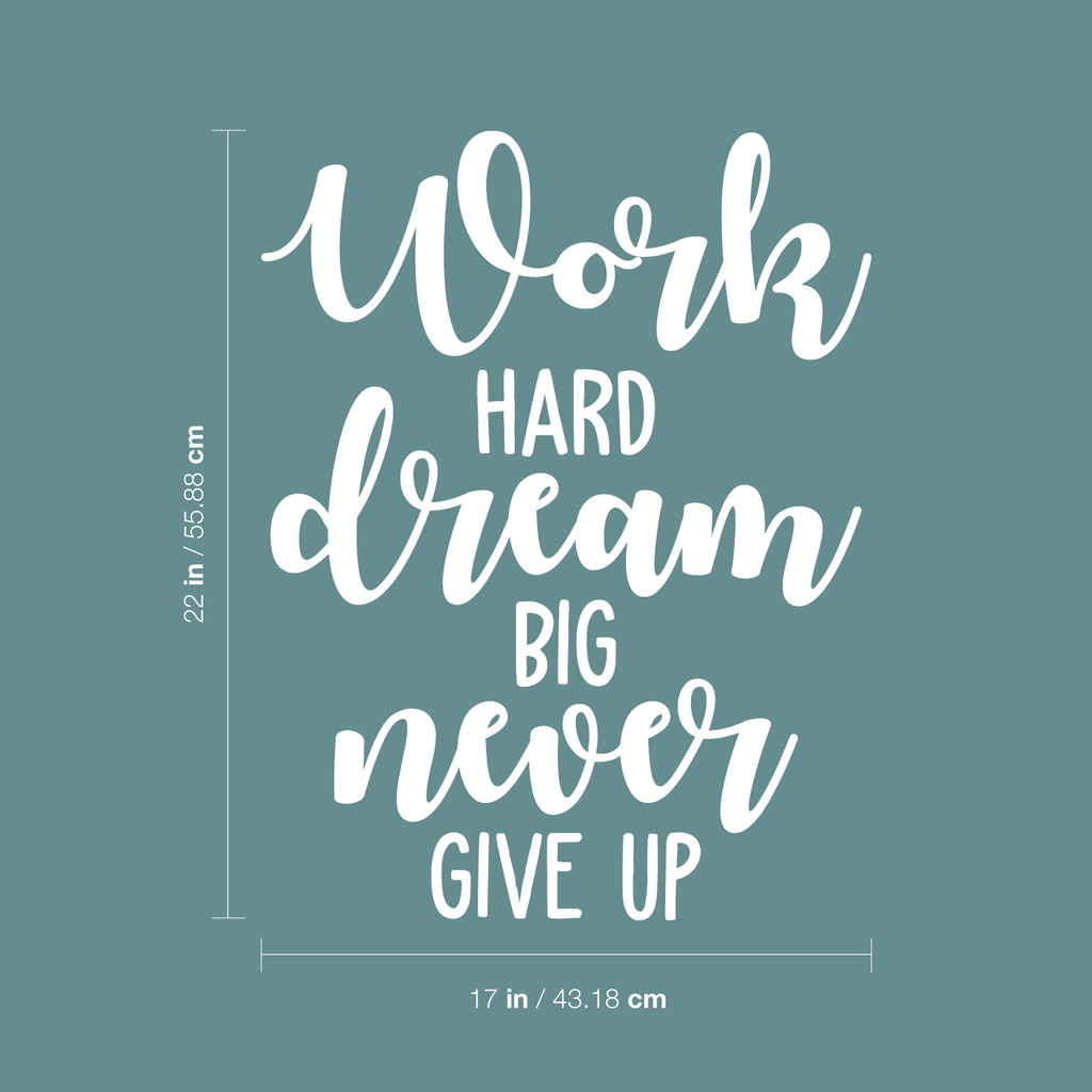 This awesome decal quote "Work Hard Dream Big Never Give Up"; is the perfect touch for your home or work. Use it for your kids room; living room; office or anywhere you want to bring some optimistic decoration. It's a vinyl sticker that is easy to put on any smooth and dry surface. Our modern designs don't just brighten up the room; but brighten up the day. Using top of the line vinyl across all of our production allows us to be the leaders in quality and design.